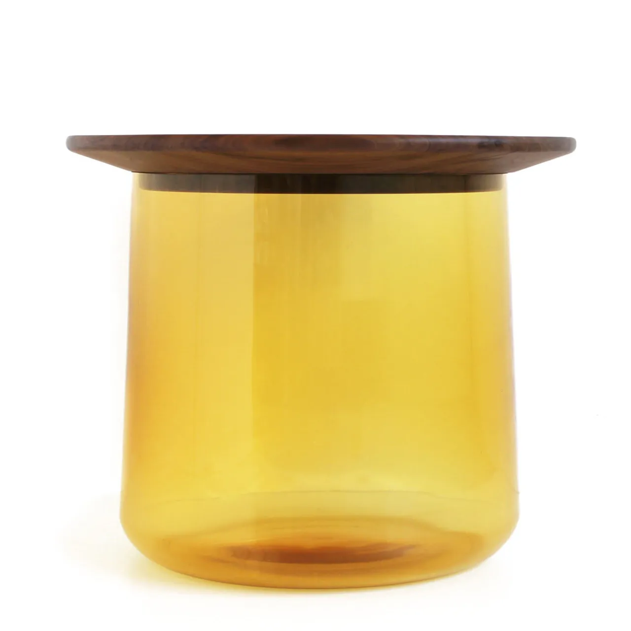 Questo suggestivo tavolino è composto da un grande vaso inferiore in vetro colorato (che può fungere da contenitore o da vano portaoggetti) e da un piano in legno massello di noce canaletto che può essere utilizzato anche come vassoio (disponibile anche in legno di rovere o in legno di rovere tinto grigio – il prezzo può variare in base alla finitura richiesta). Il vetro è disponibile nei colori ambra, fumé, azzurro e rosa.