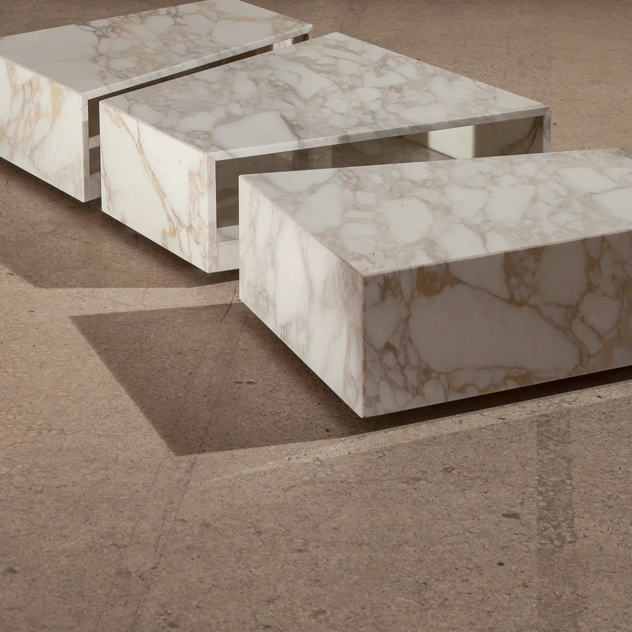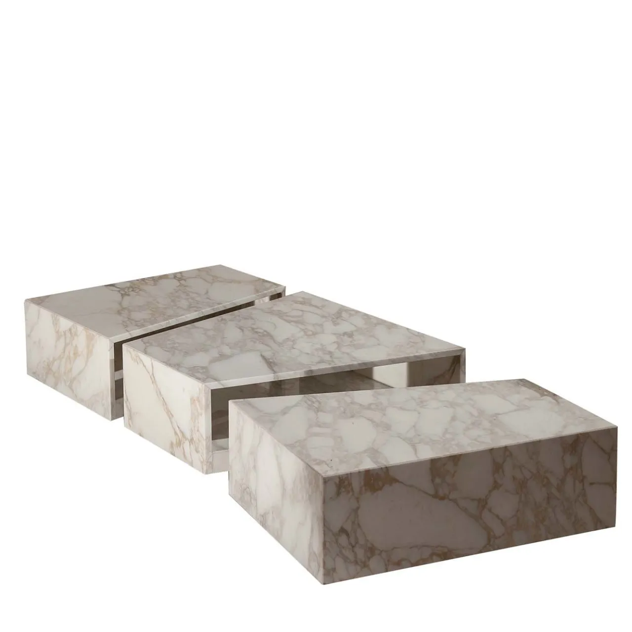 Questo maestoso tavolino non è solo un oggetto d’arredo funzionale, ma funge anche da contenitore. L’audace profilo è composto da tre pezzi dotati di ruote piroettanti, realizzati in marmo bianco Calacatta, che mostra le sue singolari e spesse venature grigie. I tavoli possono essere realizzati anche in marmo bianco di Carrara, in pietra Bardiglio Imperiale e in pietra lavica, per i dettagli rivolgersi al Concierge.