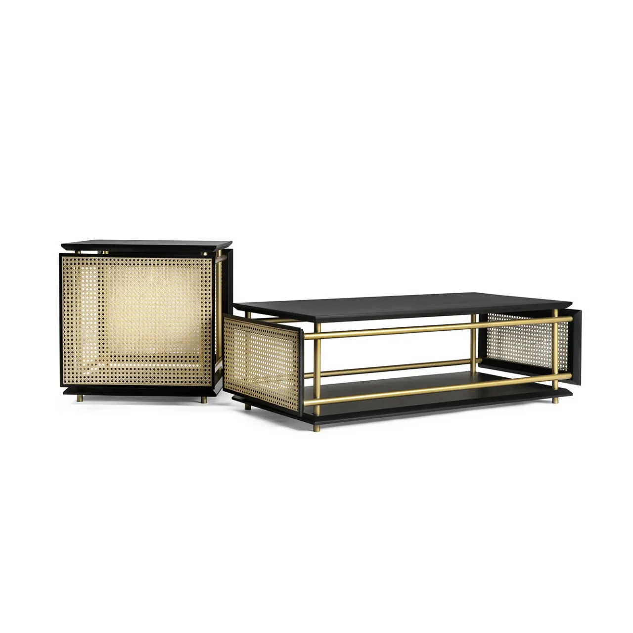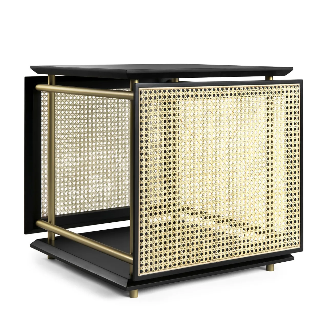 Parte di una serie unica di tavoli per il soggiorno che possono essere esposti da soli o combinati per un effetto dinamico, questo tavolino fa parte della collezione Weiner Box disegnata nel 2018 da Cristian Mohaded. Onorando il patrimonio iconico dei mobili Thonet, questo tavolino vanta lati in paglia viennese che lasciano intravedere la struttura interna del pezzo in metallo e legno laccato.