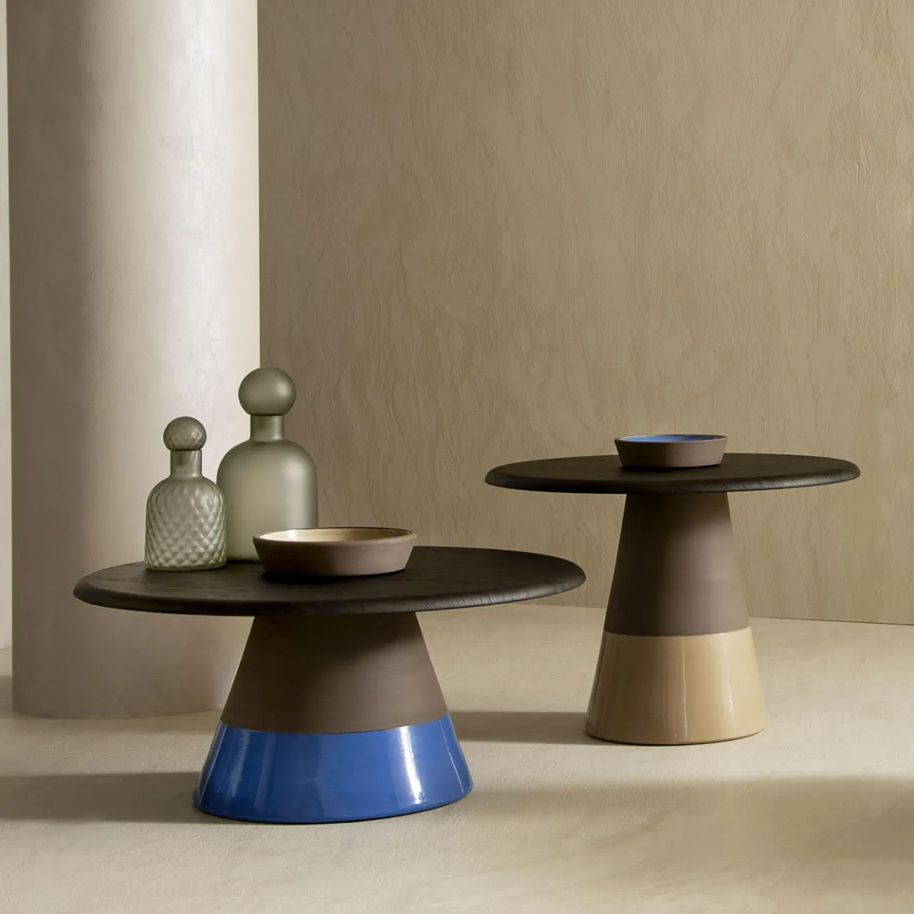 Caratterizzato da una base in terracotta naturale scura filata alla ruota, questo tavolino da salotto presenta un inserto in smalto lucido color tortora. Il piano è realizzato in MDF impiallacciato rovere Laguna e rifinito con pressatura a membrana. Un vano portaoggetti integrato in terracotta, smaltato internamente in azzurro lucido, aggiunge funzionalità ed eleganza a questo sofisticato centrotavola per ogni casa moderna.