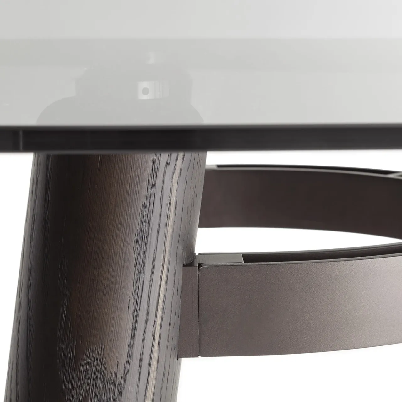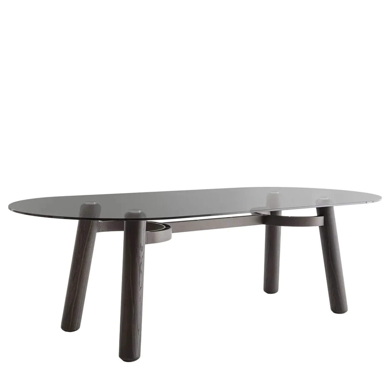Le gambe tornite in rovere massiccio proposte in una profonda finitura Laguna incanalano immediatamente il fascino audace di questo tavolo in stile moderno. Ideale per completare sale da pranzo esclusive, il suo spirito conviviale sembra confermato dalla forma arrotondata del piano allungato in vetro fumé di 12 mm di spessore, che rivela gli elementi ad arco della struttura in metallo laminato brunito – verniciato con polveri epossidiche – che rinforza la base.
