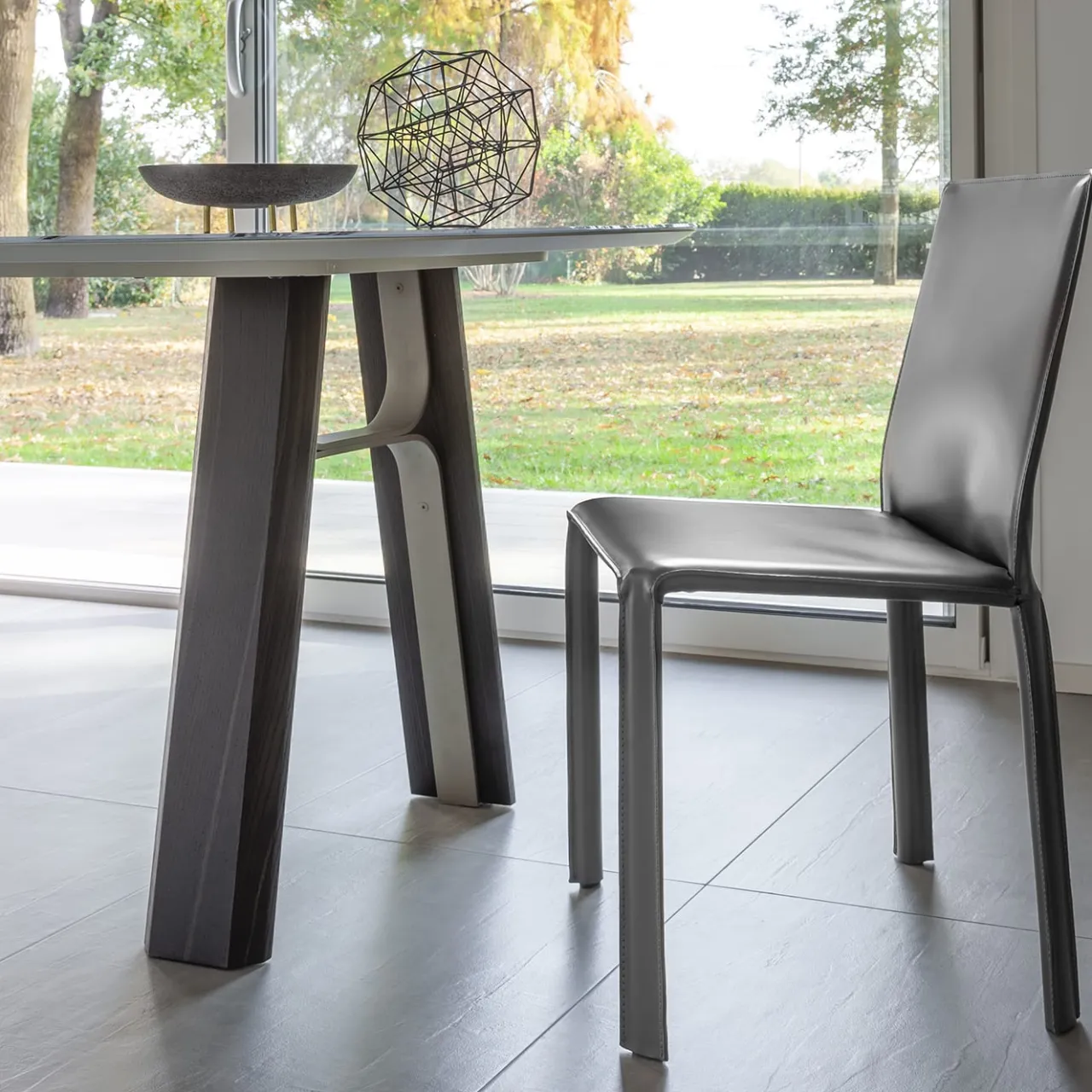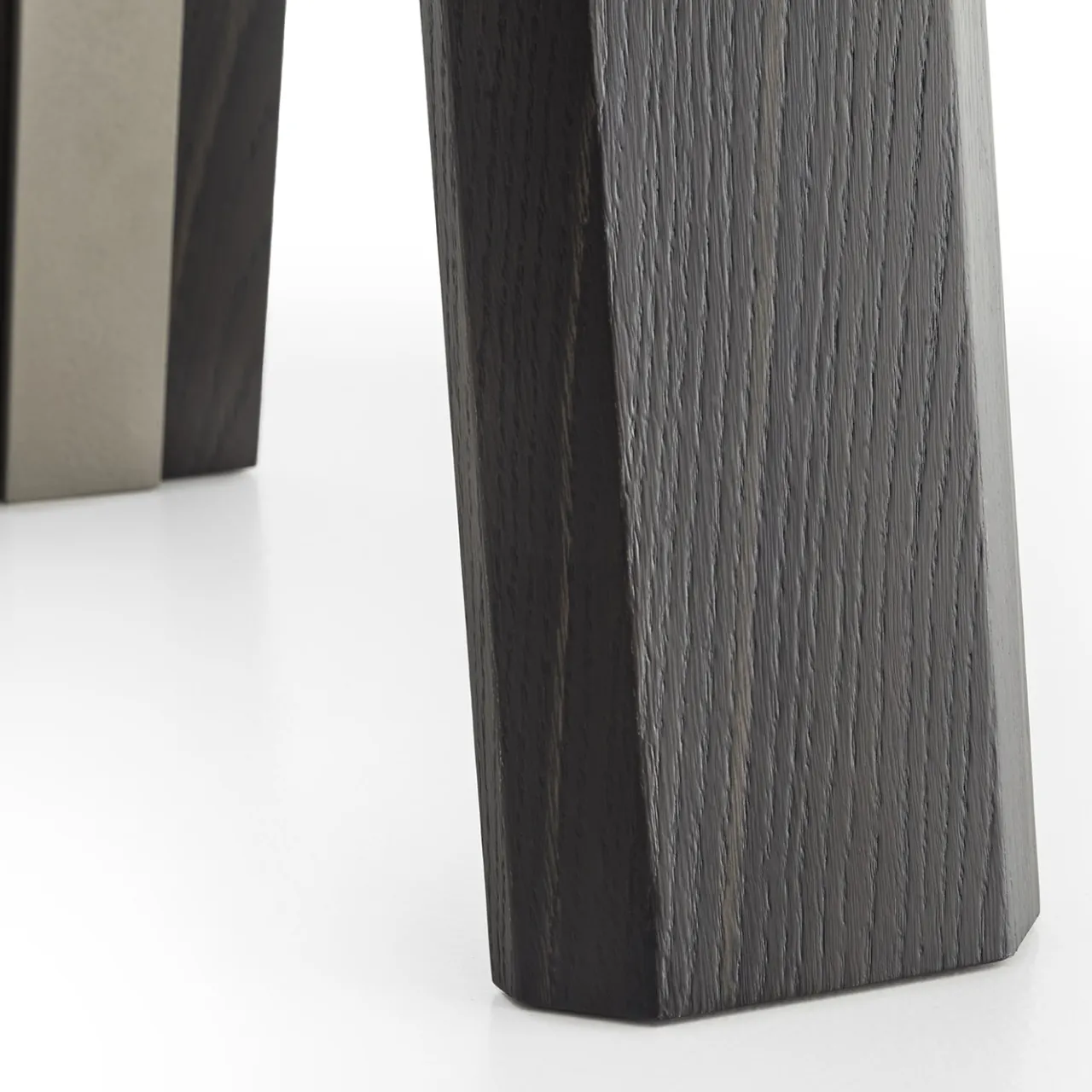 Ispirato ai ponti dalle linee fluide, questo tavolo reinventa l’opulenza con un superbo effetto marmo Trinity White. Il fedele motivo marmorizzato viene stampato su un pannello di vetro temperato sagomato che poggia su un piano in MDF smussato laccato. L’impiallacciatura in rovere Laguna dai toni intensi sottolinea le audaci gambe oblique in MDF, che risultano rinforzate da travi metalliche curve verniciate con polveri epossidiche color champagne.