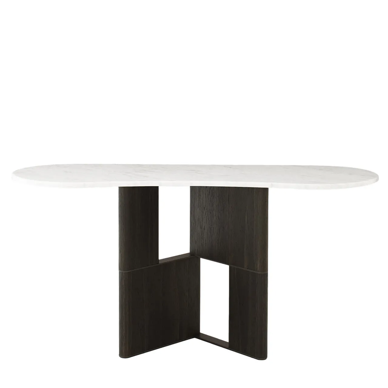 Celebrazione di una squisita maestria, questa consolle si distingue per le sue gambe curve in MDF impiallacciate in rovere Laguna e per gli inserti metallici meticolosamente lavorati, rifiniti elegantemente con polvere epossidica di colore scuro. Il piano del tavolo in marmo di Carrara a forma di fagiolo, delicatamente bordato con un profilo a mezza torsione, emana un fascino e una raffinatezza senza tempo. Una fusione armoniosa di design moderno e dettagli artigianali, questo pezzo promette di abbellire qualsiasi ambiente con una raffinatezza senza pari e un fascino lussuoso.