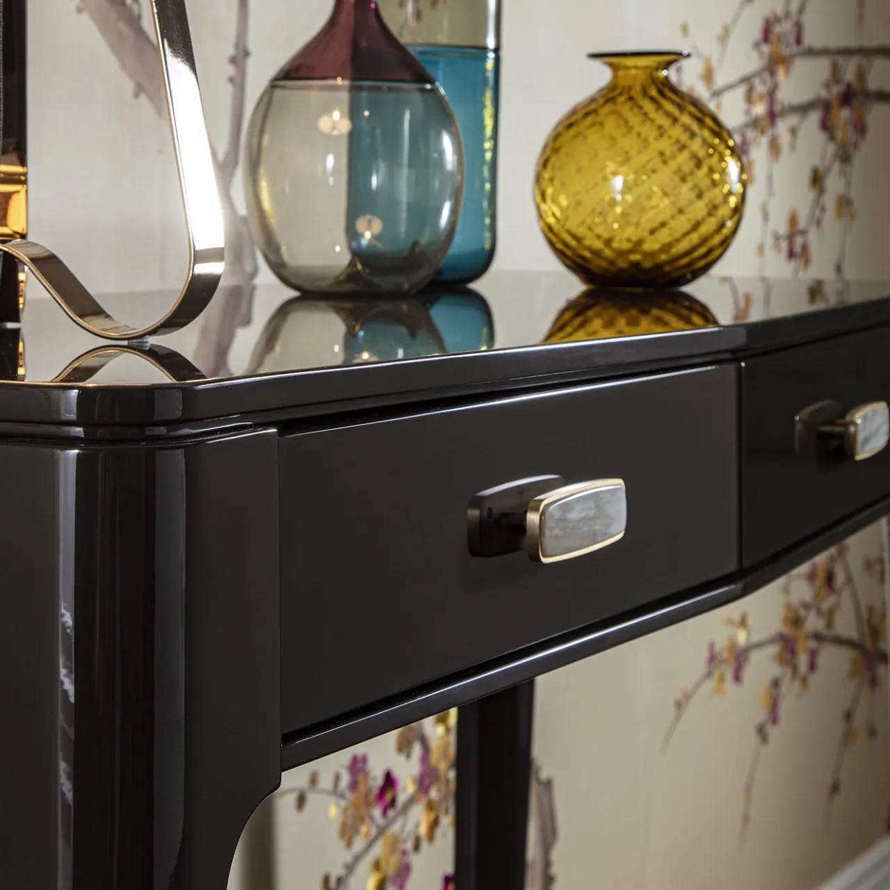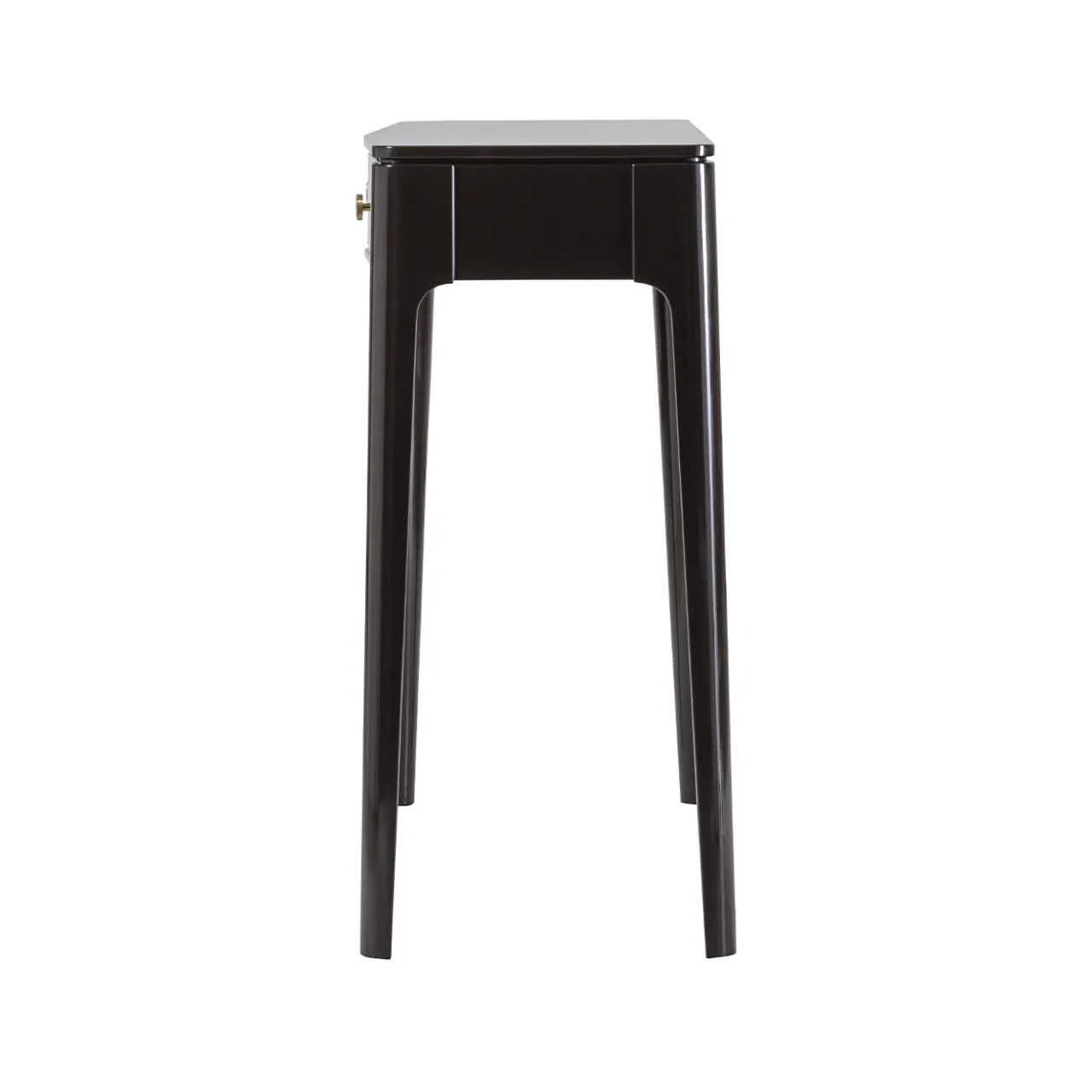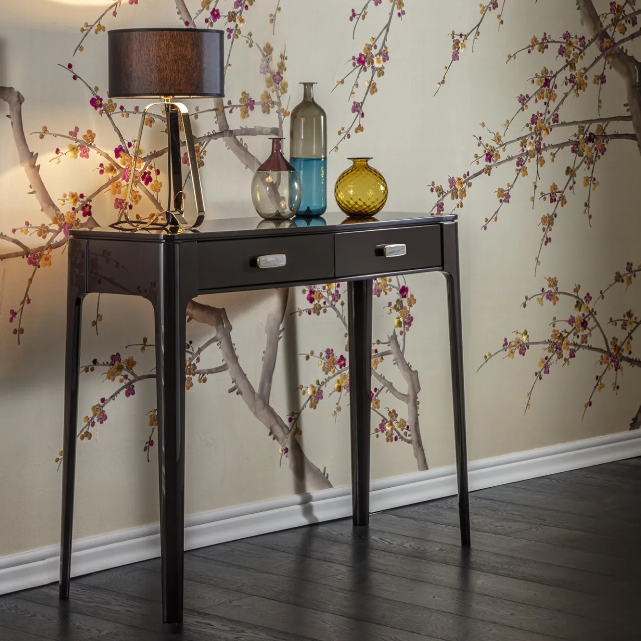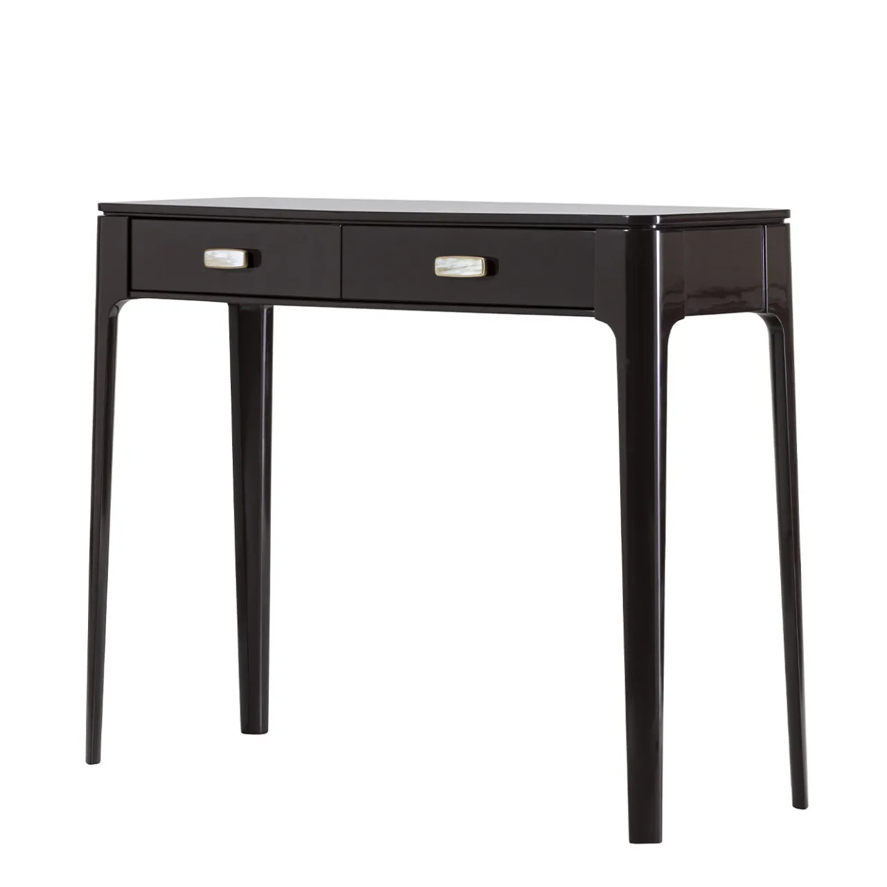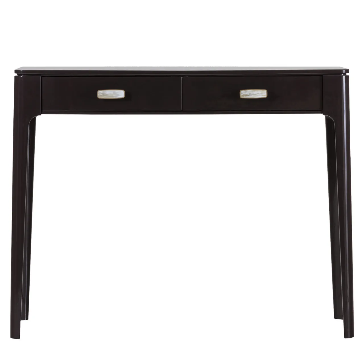 Questa elegante consolle reinterpreta lo stile anni ’50 in chiave contemporanea. Caratterizzata da profili fluidi e volumi ben bilanciati, la struttura in legno è laccata in marrone scuro lucido e offre due cassetti dotati di piccole maniglie in ottone impreziosite da inserti in corno di bufalo. Elegante e senza tempo, questo design è disponibile in un’ampia gamma di laccature opache e lucide; per maggiori dettagli, rivolgersi al Concierge.