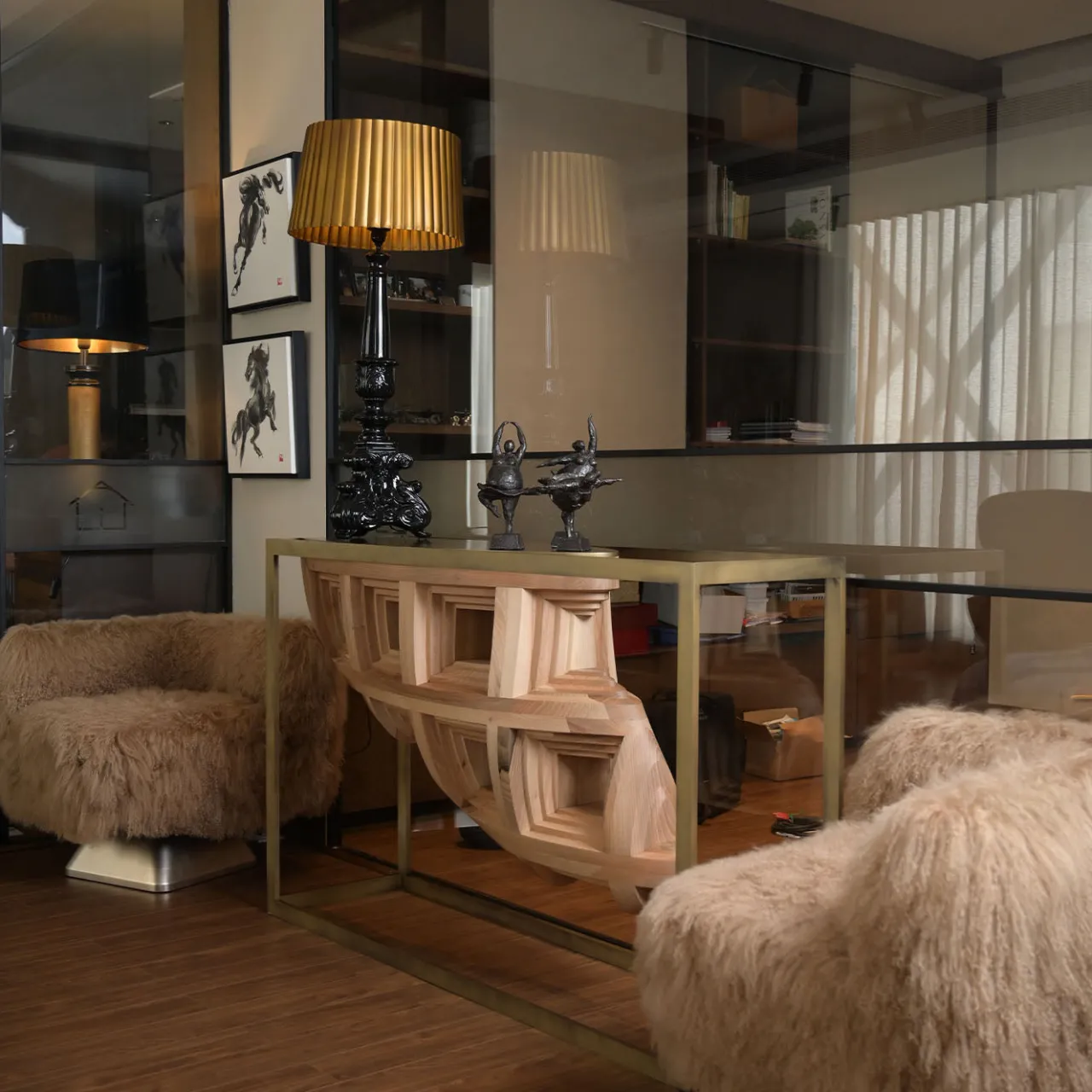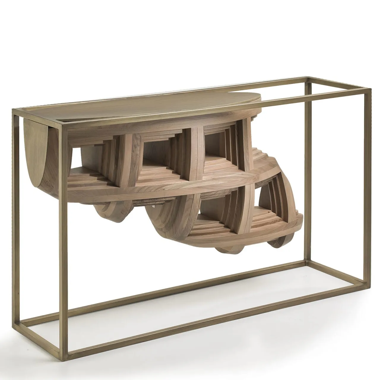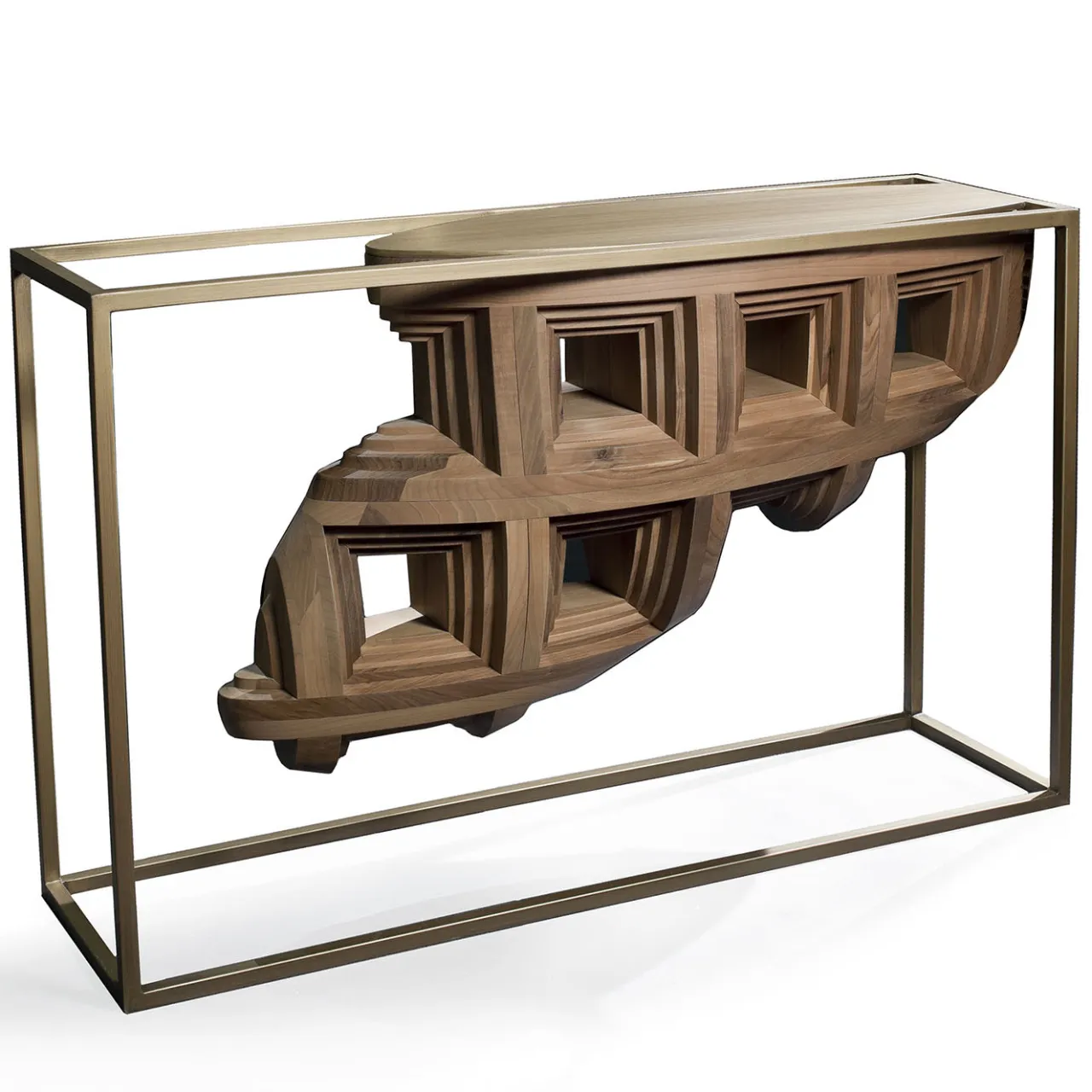 La struttura in metallo bronzato della console Rebus emana un’eleganza geometrica, cullando un frammento di legno dalla forma organica. Ispirato alla cupola del Pantheon, il pezzo in noce massiccio, intricato con dettagli a cassettoni, crea una struttura visivamente ipnotica e graziosamente perforata.