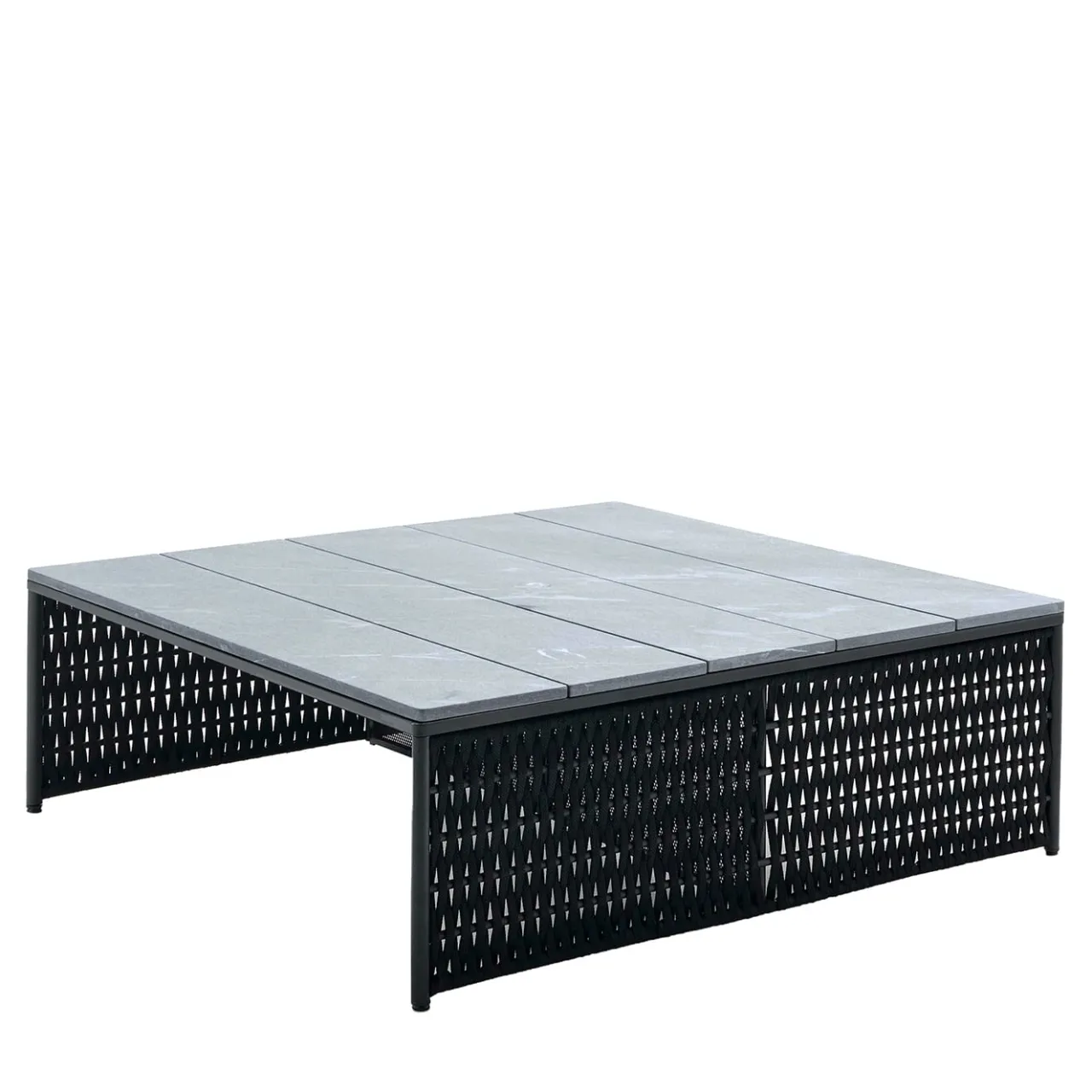 Tavolo da cocktail quadrato per esterni in una combinazione di metallo nero satinato trattato in cataforesi e cordame nero intrecciato. Piano in doghe di pietra naturale trattata “CARDOSO” con logo Giorgio Collection inserito. Speciale copertura per esterni inclusa nel prezzo.