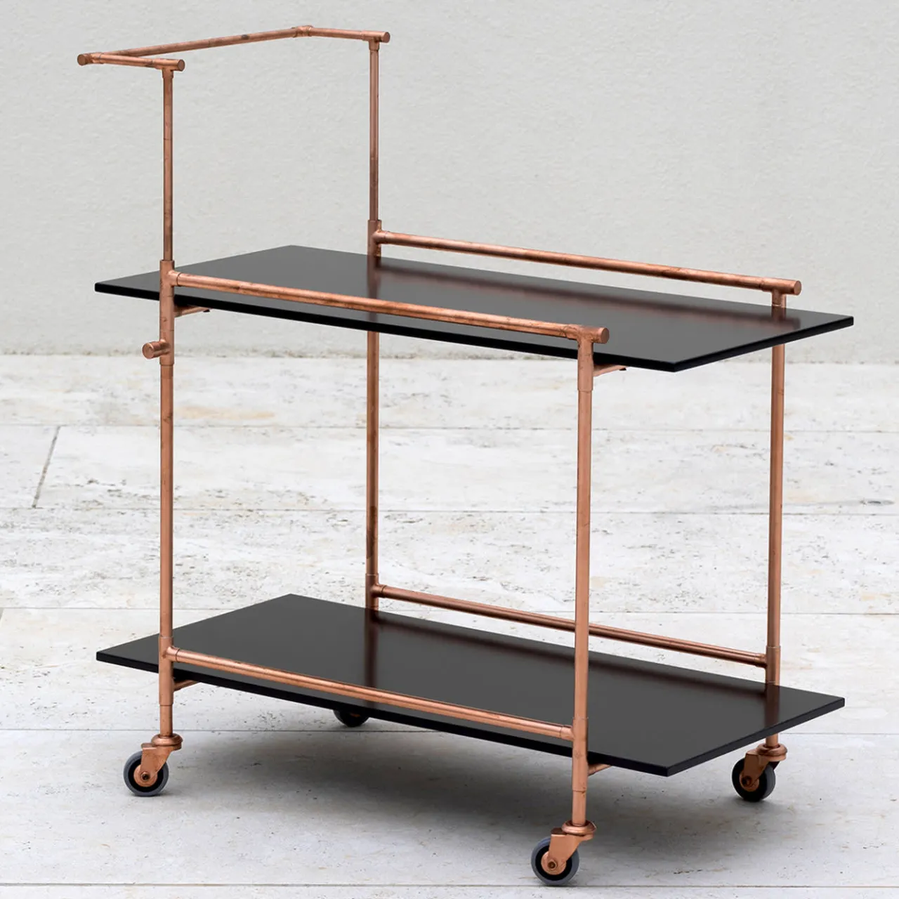 Interpretazione contemporanea del classico carrello portavivande, il carrello rosso è concepito come una composizione costruttiva che evoca il design razionalista degli anni Trenta. La struttura è costituita da elementi tubolari e raccordi a “T” in rame che incorniciano i piani in legno laccato. I dettagli in ottone impreziosiscono ulteriormente le giunzioni della struttura. Una maniglia retrattile ne facilita l’uso quando si è in viaggio.