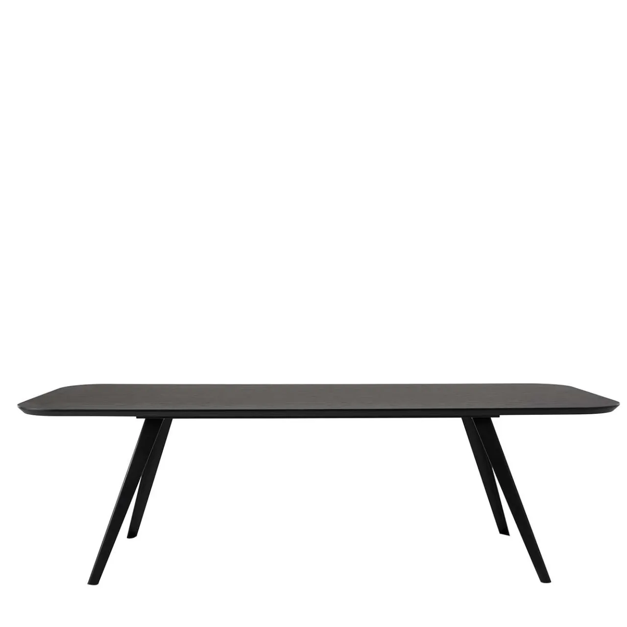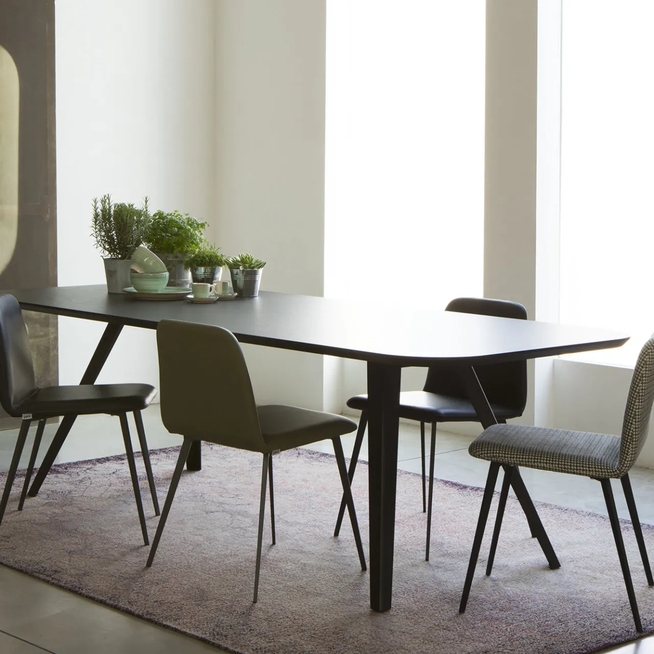Testimonianza di un design minimalista, questo tavolo da pranzo è caratterizzato da una silhouette unica composta da quattro gambe inclinate in metallo che ricordano le postazioni di lavoro degli artigiani e da un ampio piano in MDF di frassino-venere con finitura nera a poro aperto. Disponibile anche nei toni naturali del frassino, frassino sbiancato o tinto cacao, la collezione Amy Met offre opzioni versatili con piani quadrati, rotondi e rettangolari.