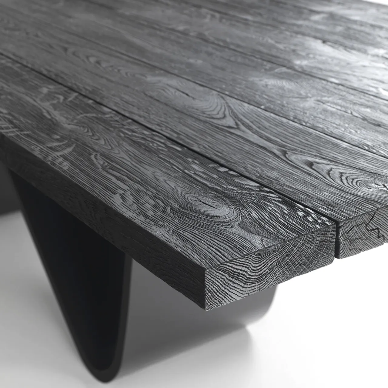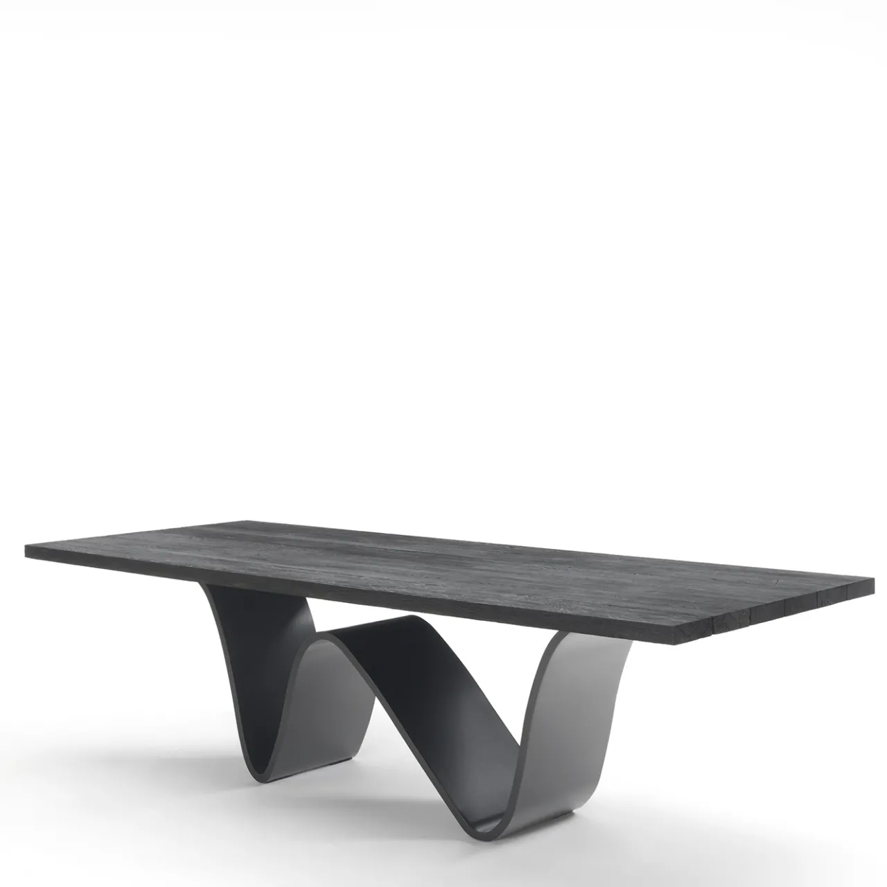 Tavolo da pranzo con piano in rovere massello rifinito con una pigmentazione nera liscia, abbinato a una base in ferro dal design distintivo, modellata in curve eleganti e fluide che richiamano il movimento delle onde del mare. Il piano, a bordi squadrati e in rovere senza nodi, offre un aspetto raffinato ma al tempo stesso naturale. La base è rifinita con una resistente laccatura Irondust. Progettato da Passon & Savorgnani, questo tavolo unisce forma scultorea e funzionalità in un elemento di forte impatto visivo.