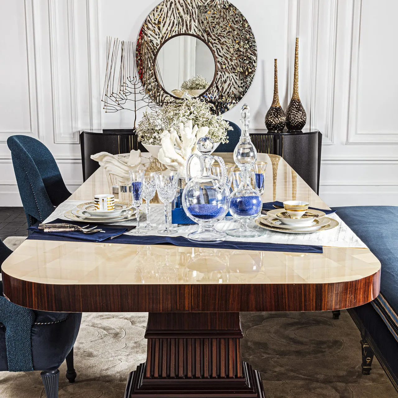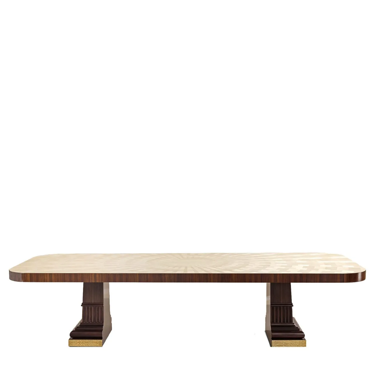 Tavolo da pranzo con piano in acero naturale intarsiato e piedistalli in palissandro e mogano massiccio.