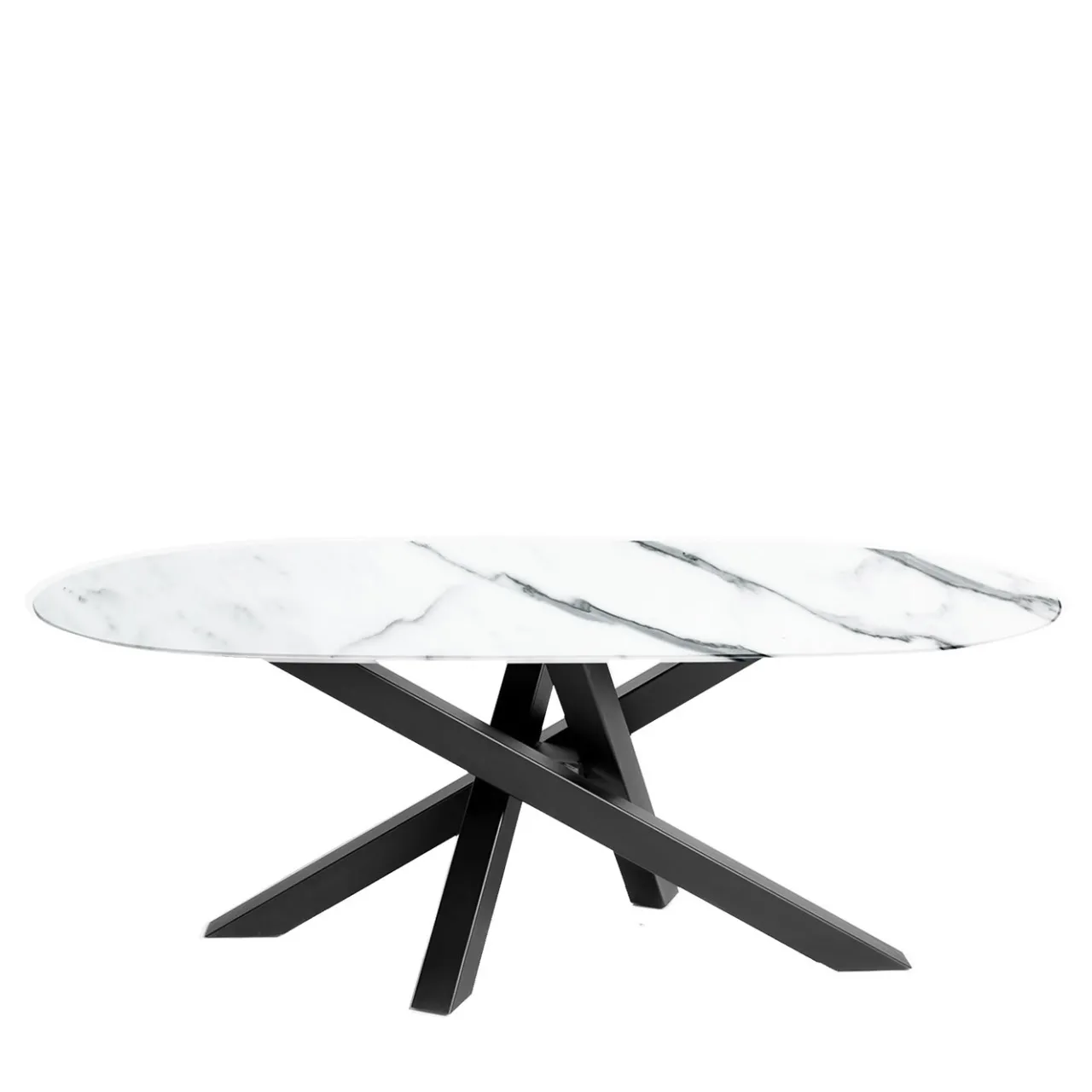 Questo maestoso tavolo da pranzo è ricco di dinamismo grazie a un impeccabile processo artigianale che ne esalta la sensazione tattile. Le gambe inclinate e audaci, in ferro laccato nero, sono saldate manualmente e disposte in un fascio che sostiene il piano ovale realizzato artigianalmente in pregiato marmo bianco di Carrara, che presenta venature molto espressive. La finitura metallica è disponibile in tonalità oro o grigio e il piano è disponibile in altri tipi di marmo; per dettagli e prezzi, rivolgersi al Concierge.