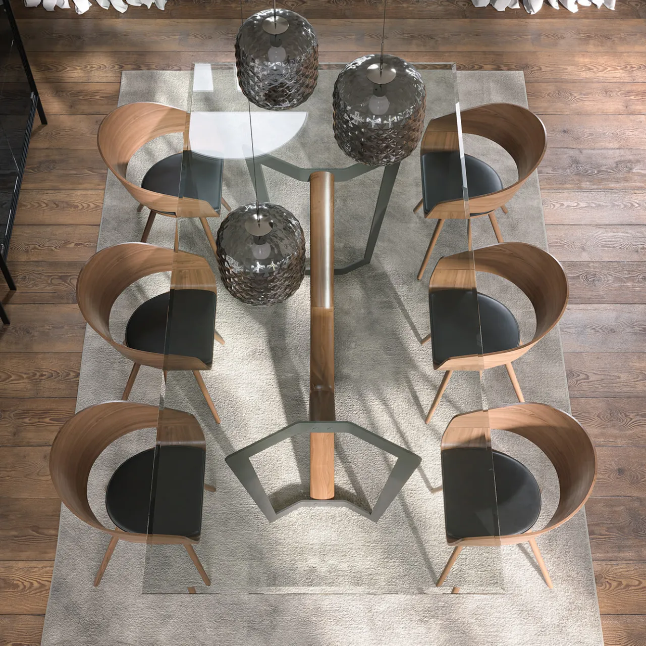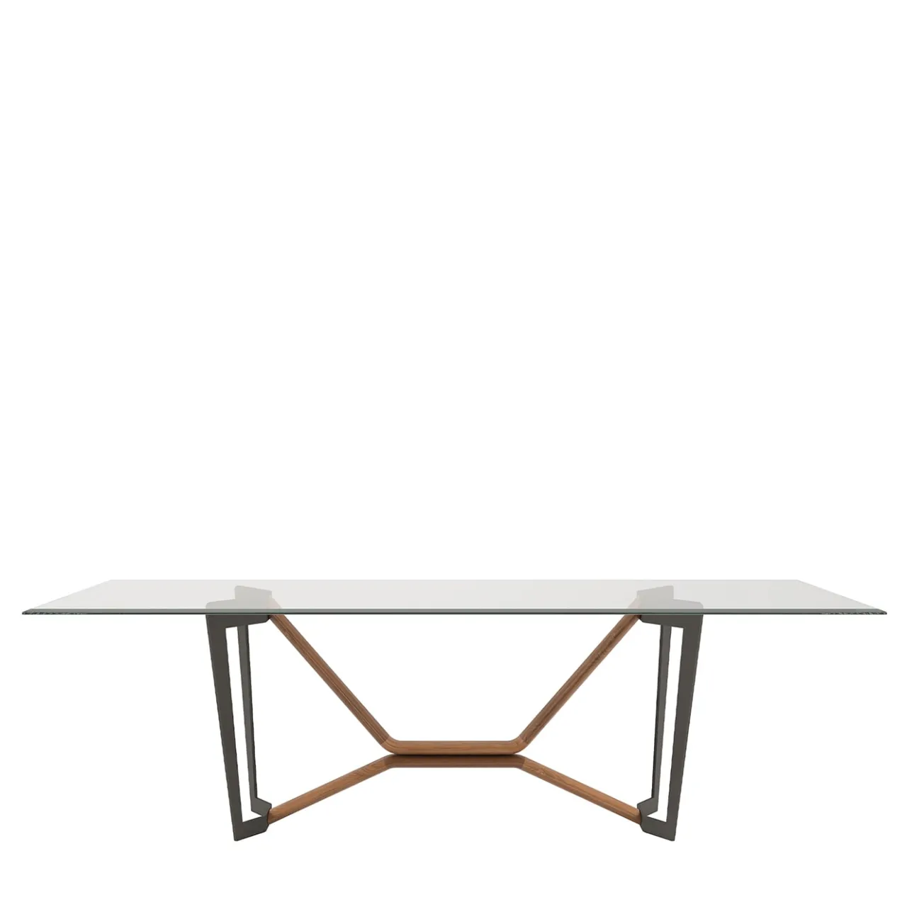 Il tavolo Oliver incarna una fusione architettonica di materiali senza soluzione di continuità. La sua base, realizzata in metallo verniciato a polvere color bronzo e noce canaletto massiccio, sostiene elegantemente un piano rettangolare in vetro extrachiaro smussato, creando un sofisticato equilibrio di forza e trasparenza.