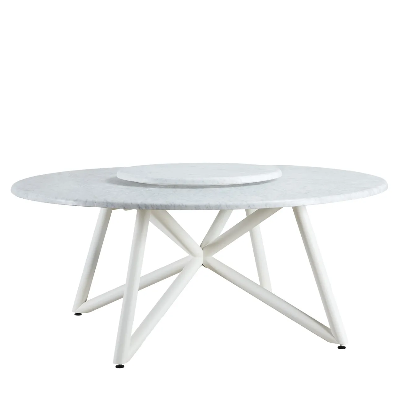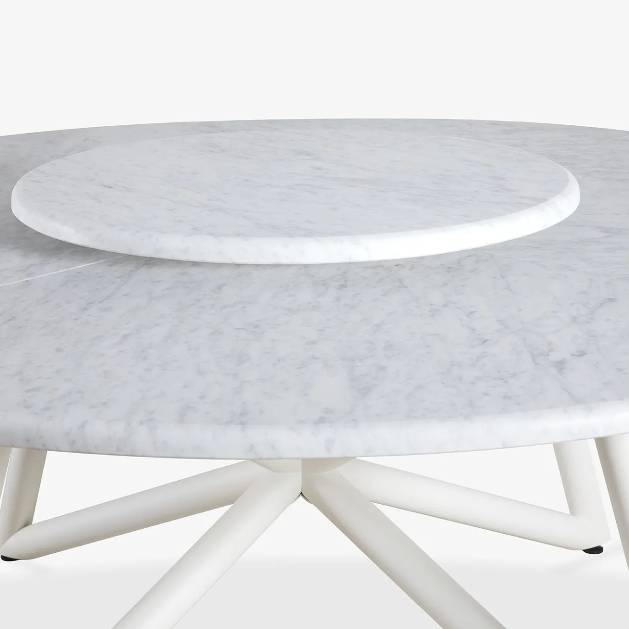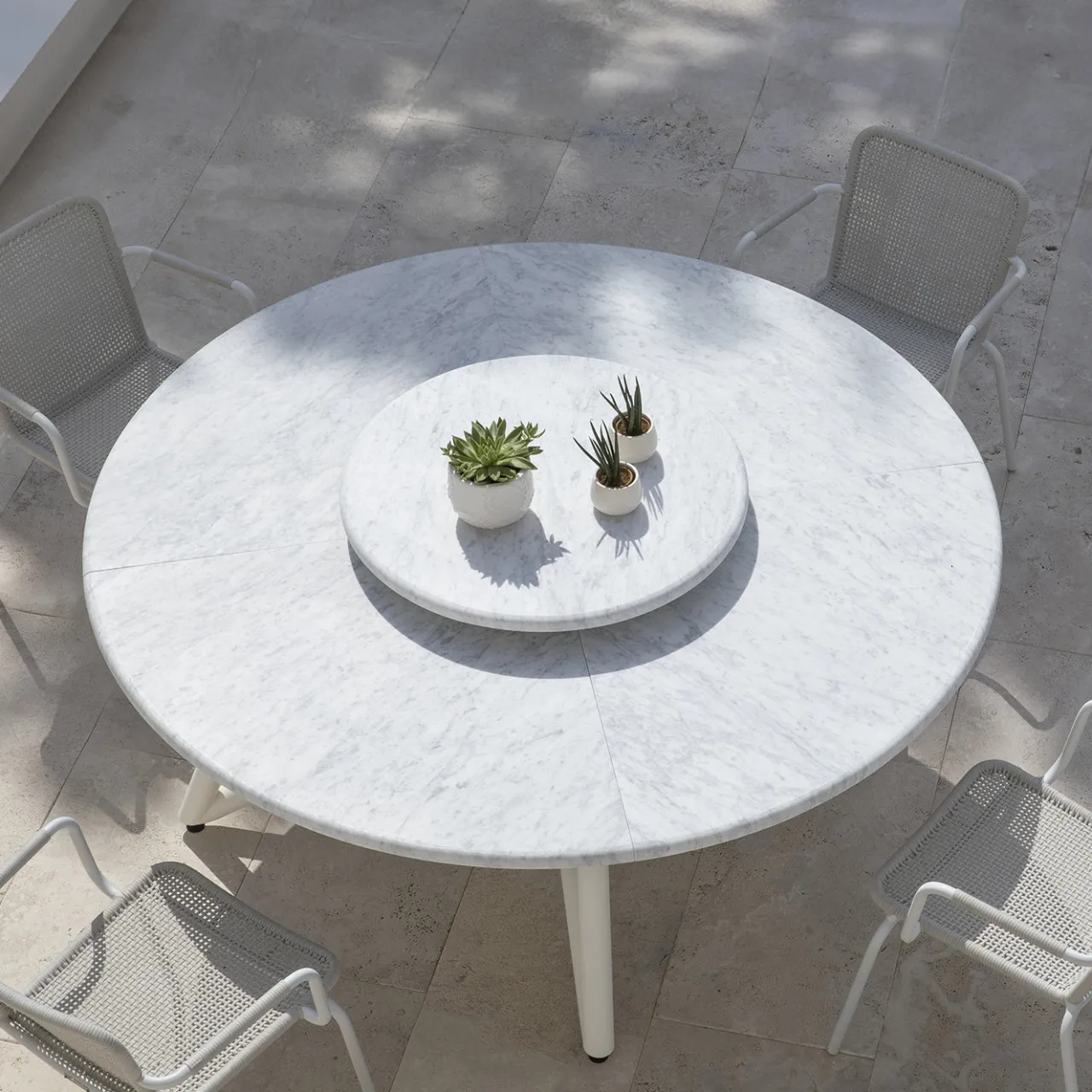 Il tavolo Hermu presenta un piano rotondo realizzato in marmo di Carrara, rinomato per la sua eleganza senza tempo e le venature naturali. Il piano è composto da quattro segmenti tagliati con maestria, uniti senza soluzione di continuità da un supporto metallico centrale. Al centro, un piano rotante (⌀ 80 cm) aggiunge praticità e un raffinato punto focale. La superficie è levigata e trattata con finiture resistenti a macchie e pioggia, mentre i bordi arrotondati accentuano l’appeal scultoreo. La base è realizzata in tubi di acciaio zincato intrecciati, verniciati di bianco brillante con polveri termoindurenti adatte per esterni, offrendo sia durata che un’estetica leggera e contemporanea. Questo modello è disponibile anche in altre dimensioni e materiali nel catalogo Artemest. Si prega di contattare il Concierge per ulteriori informazioni.