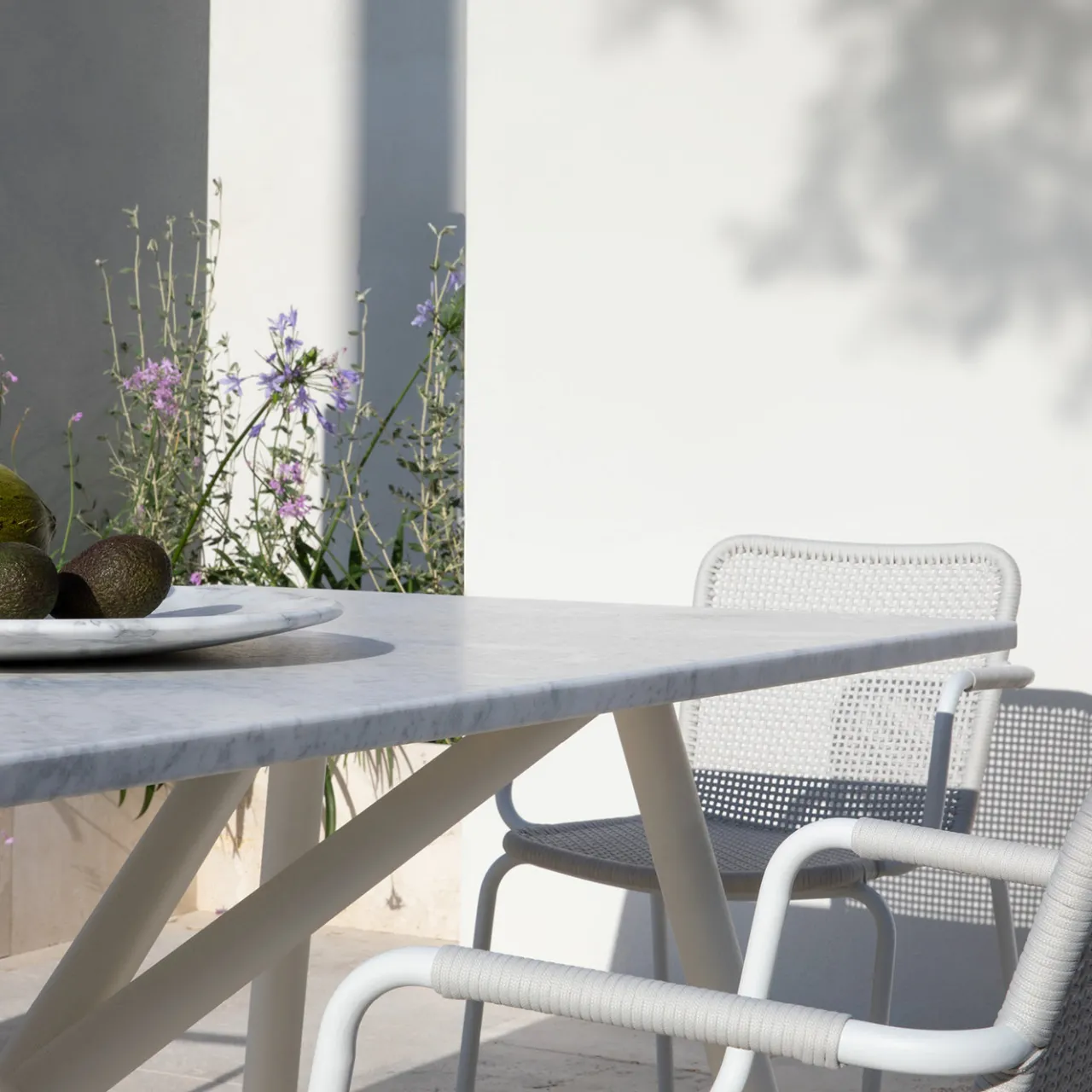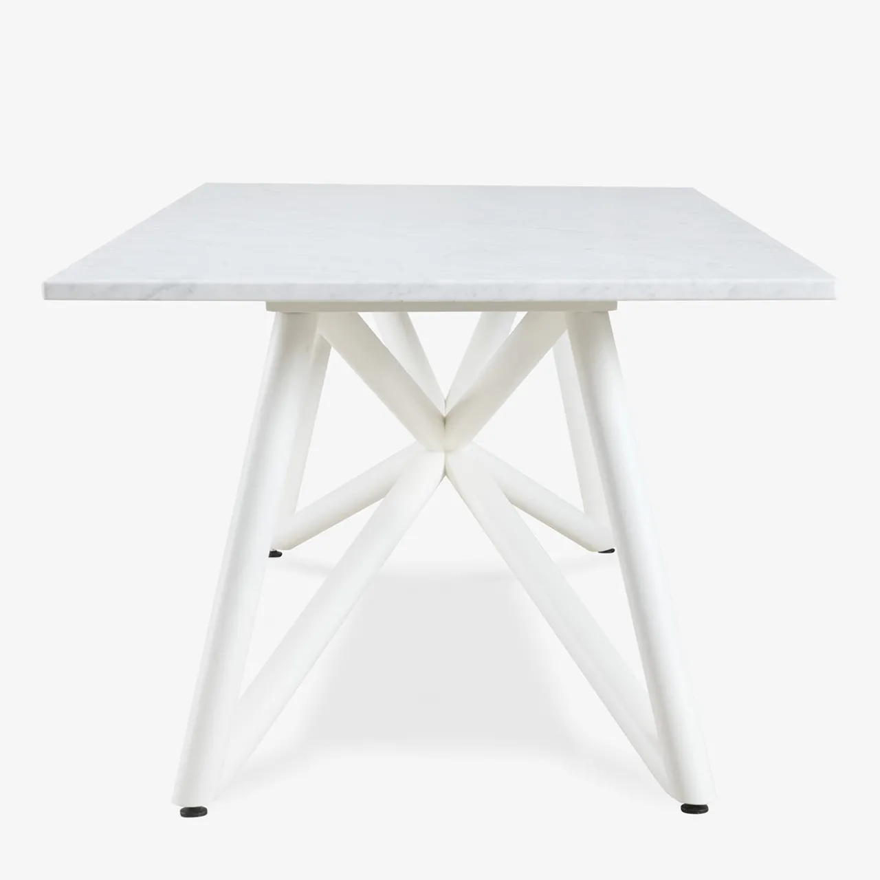 Tavolo scultoreo con piano rettangolare in marmo bianco di Carrara, caratterizzato da una superficie liscia e bordi arrotondati, trattato per resistere a macchie e pioggia. La base è composta da tubi in acciaio zincato intrecciati, verniciati a polvere in bianco con finiture termoindurenti, ideali per l’uso esterno. Realizzato con precisione grazie a tecnologie avanzate di taglio CNC e saldatura, il tavolo Larte unisce materiali senza tempo a un design contemporaneo.