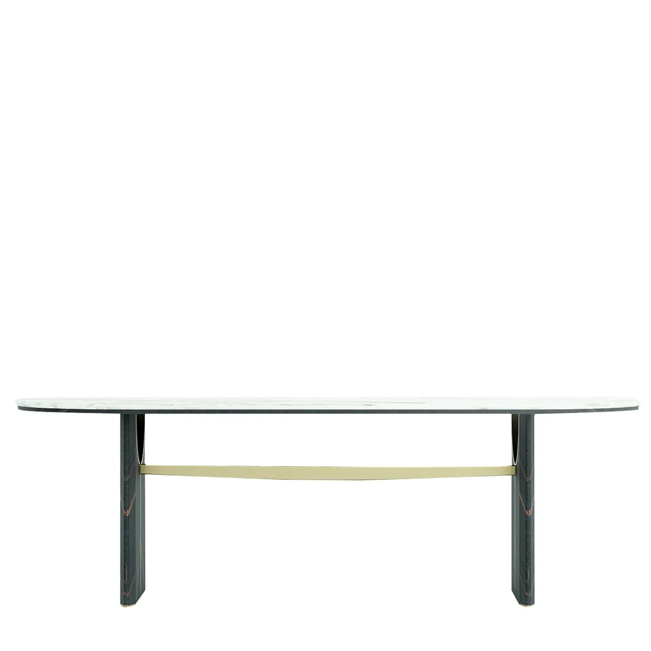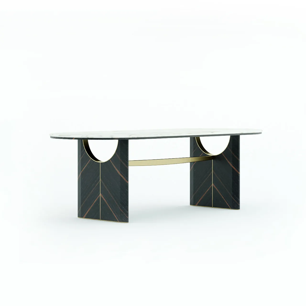 Tavolo da pranzo con raffinato piano ovale in marmo, sostenuto da una base in legno laccato. Le due gambe in legno lucido presentano bordi arrotondati e sono impreziosite da un intaglio a mezzaluna che accoglie un elemento decorativo in metallo, ispirato alla forma di una sciabola orizzontale. Disponibile in una selezione di finiture su richiesta. Per ulteriori informazioni, si prega di contattare il Concierge.