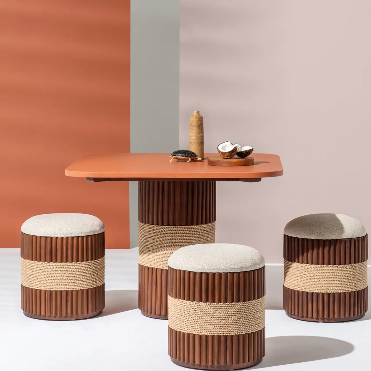 Il tavolo da pranzo Grissini unisce design contemporaneo e artigianalità raffinata, con linee pulite e una base a colonna unica ispirata alle forme lineari dei grissini torinesi. La struttura è impreziosita da un dettaglio in corda avvolta, che ne esalta il carattere scultoreo. Progettato per ambienti interni ed esterni, è rifinito con olio e cera per garantirne la durata e conferire una piacevole lucentezza.
