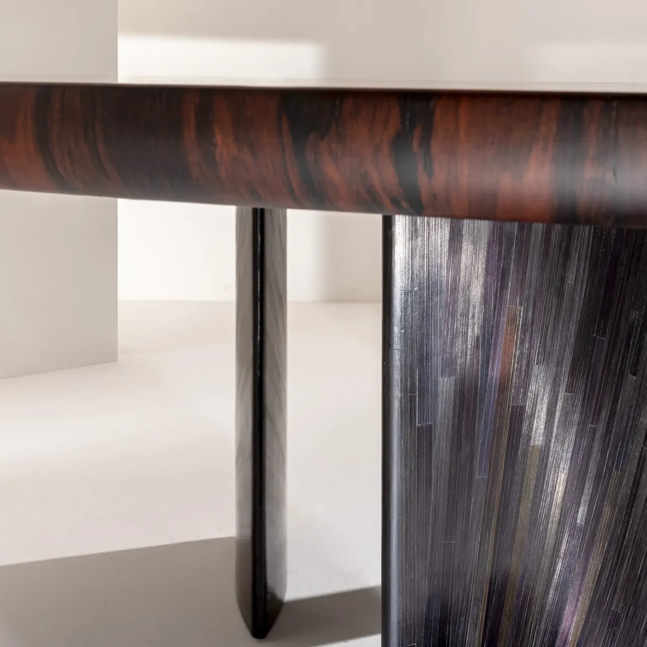 Tavolo da pranzo di grande effetto, con piano in legno intarsiato e gambe ovoidali, disponibile in varie forme e dimensioni, tra cui ellittica, rotonda, quadrata e rettangolare. Il piano è realizzato in legno liscio, tinto o laccato, oltre che in marmo, mentre le gambe possono essere personalizzate con finiture in legno, bronzo o paglia di segale. Progettato per la versatilità e l’eleganza. Per le opzioni di personalizzazione, contattare il Concierge.