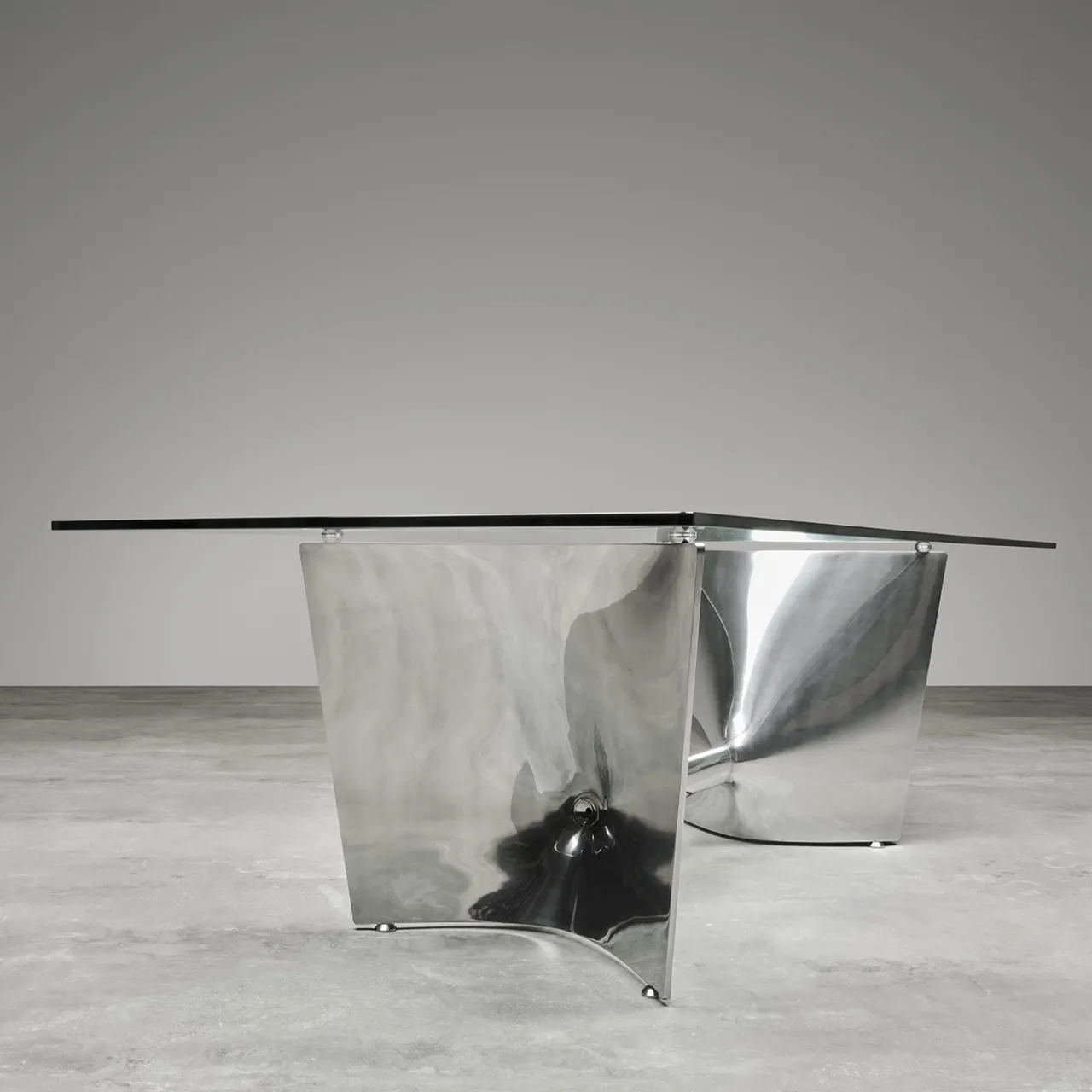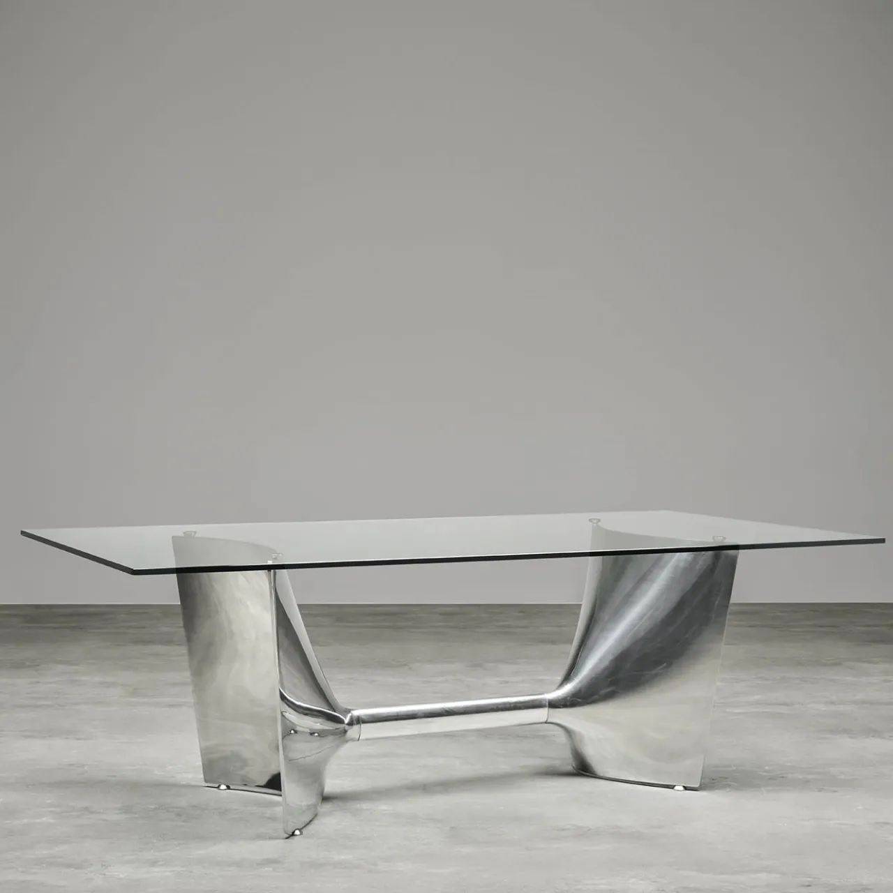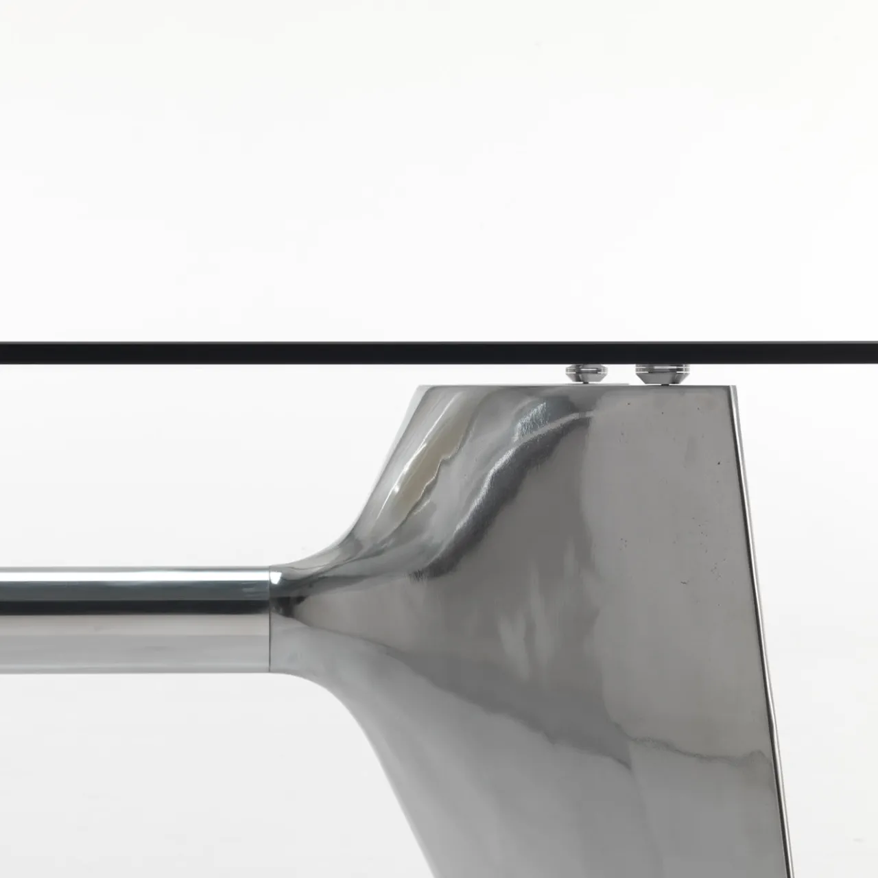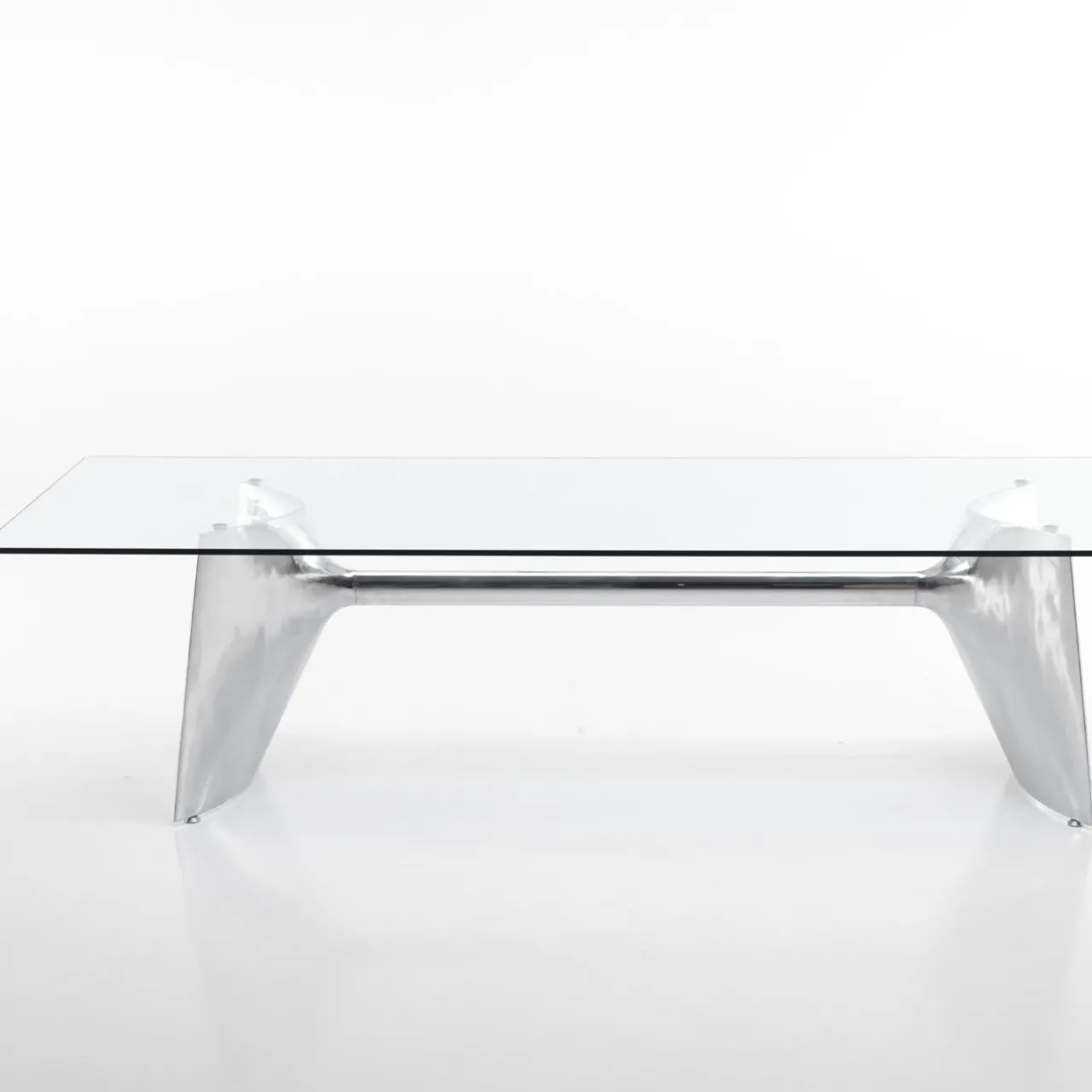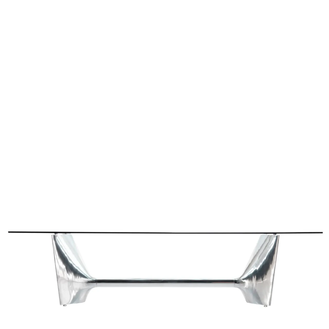 Disegnato da Jeff Miller, questo elegante tavolo presenta una straordinaria combinazione di materiali che animerà una sala da pranzo moderna con uno stile scintillante. Il piano rettangolare è realizzato in vetro temperato extrachiaro che lascia intravedere la straordinaria base in alluminio lucido composta da due frontoni a conchiglia speculari collegati da una trave ellittica estrusa. La base può essere capovolta e utilizzata con la trave centrale in alto. Disponibile anche con piano in MDF, teak naturale, frassino naturale o moka, e in altre dimensioni abbinabili alla base personalizzabile.