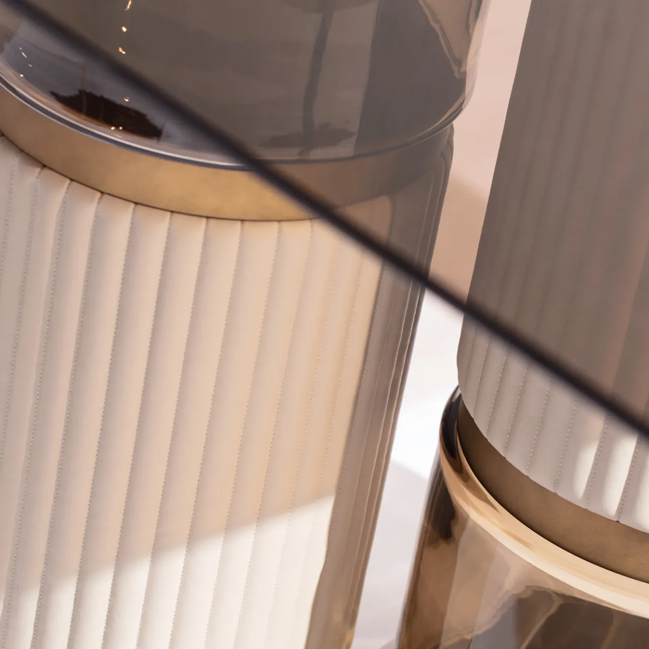 Definito da raffinate linee scultoree e da proporzioni asimmetriche ma equilibrate, questo splendido tavolo da pranzo abbina un piano rettangolare in vetro bronzato a una base straordinariamente composta in Vitroplex e pelle pregiata. La pelle, che presenta una tonalità crema impreziosita da spettacolari cuciture verticali, può essere personalizzata nel colore e nel tipo su richiesta. Per ulteriori opzioni di personalizzazione, rivolgersi al Concierge.