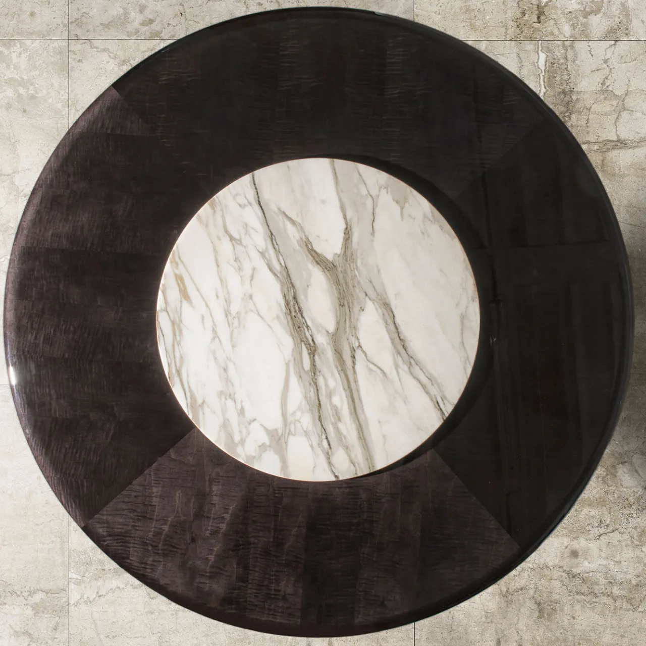 Un tavolo da pranzo rotondo con una base elegante con finitura in metallo laccato e un piano in legno di color pantera. Il centrale lazy susan in marmo migliora la funzionalità e lo stile, mentre la gamba è elegantemente rivestita in Econabuk. Disponibile in diverse misure e senza l’opzione lazy susan, questo tavolo fonde design moderno con esigenze pratiche di dining. Contatta il Concierge per ulteriori dettagli.