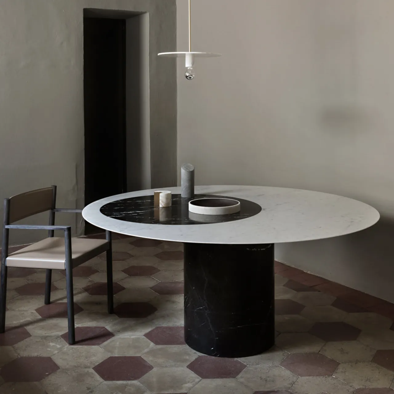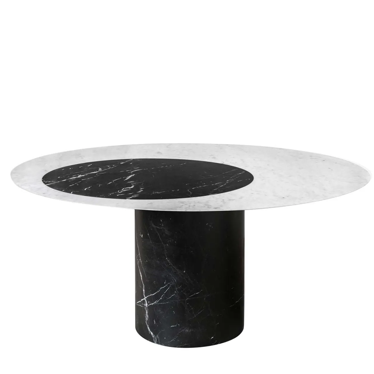 Un design essenziale e materiali eleganti rendono questo tavolo un’elegante aggiunta a un arredamento monocromatico o minimalista del soggiorno. Parte della collezione Proiezioni, ispirata al gioco geometrico di luci e ombre, questo maestoso tavolo da pranzo presenta uno squisito piano rotondo in marmo bianco di Carrara accentuato da un cerchio di intarsio in Marquina nera che crea l’effetto di un riflettore su un palcoscenico. La base a pilastro in Marquina nera è imponente e conferisce un tocco scultoreo a questo pezzo opulento che completerà un interno contemporaneo.