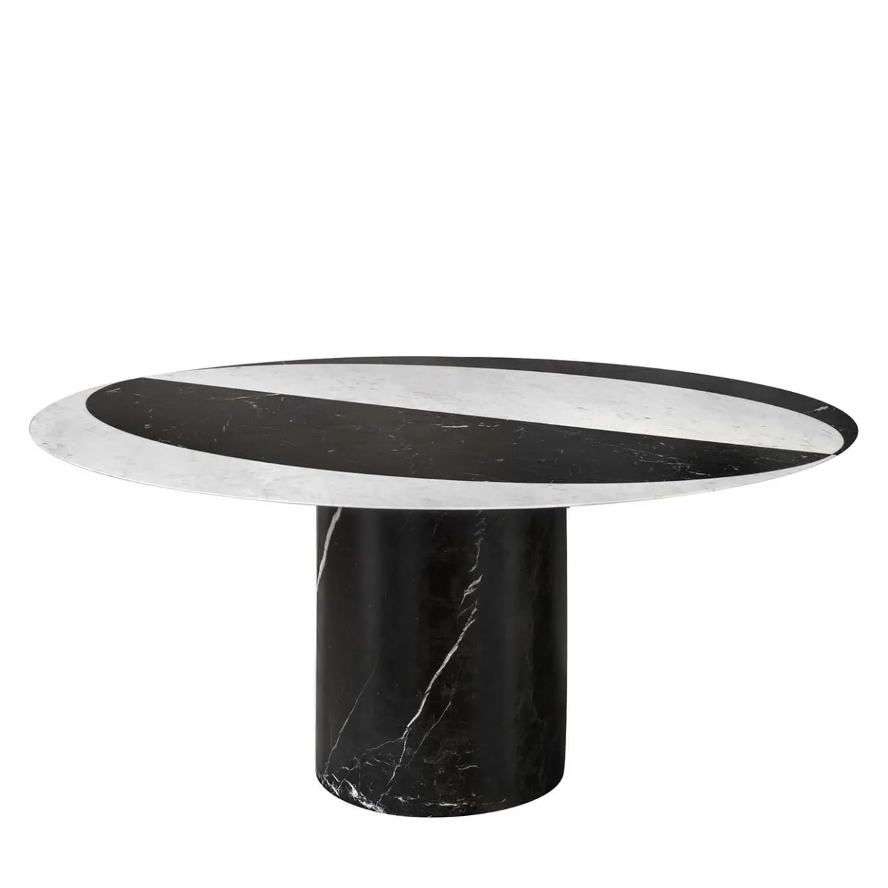 Parte della collezione Proiezioni, questo tavolo da pranzo contemporaneo fonde scultura e design per una silhouette straordinariamente elegante. Sostenuto da un’imponente base a pilastro in marmo nero Marquina, il piano rotondo si distingue per l’intarsio di semicerchi in bianco Carrara e nero Marquina che evocano l’immagine dei riflessi della luce sulla superficie. Il drammatico gioco di colori e texture dei due marmi dà vita a un contrasto grafico che aggiungerà un tocco drammatico all’arredamento di qualsiasi salotto.
