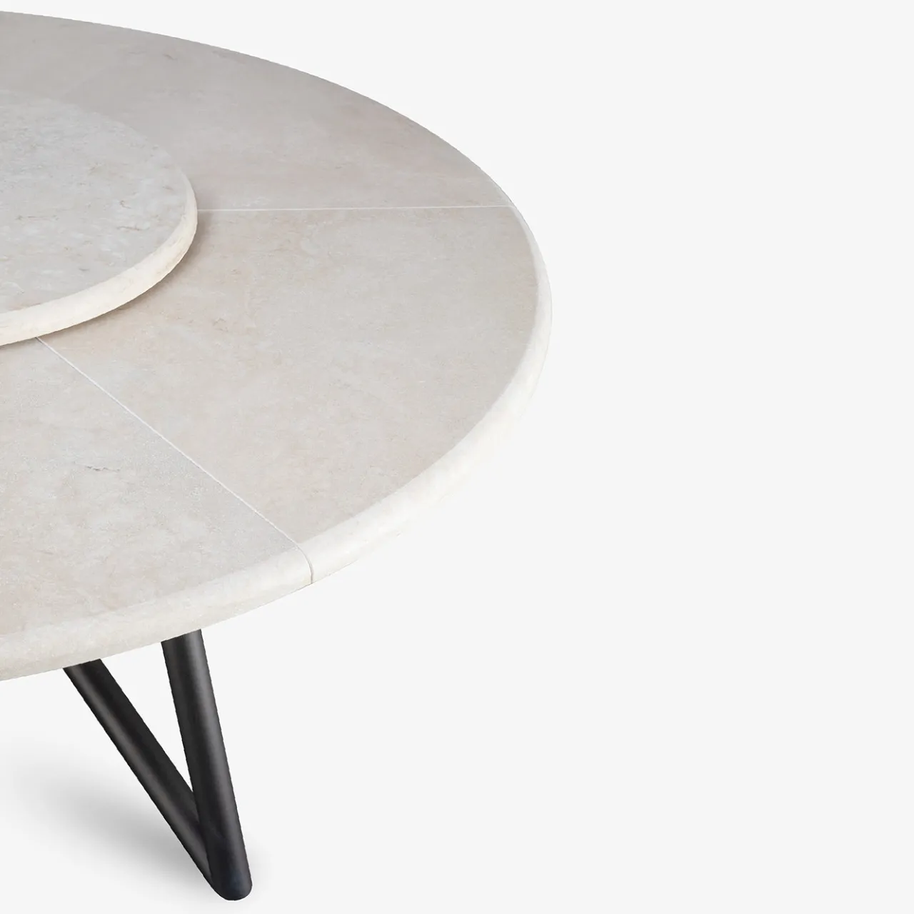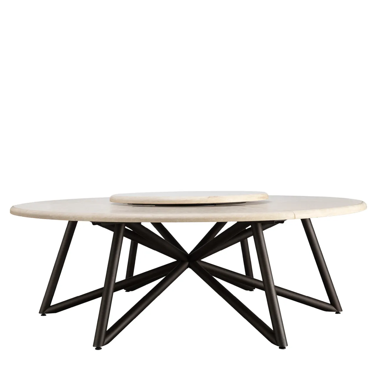 Il Tavolo Hermu presenta un piano in travertino segmentato, ciascun pezzo unito perfettamente da un supporto metallico centrale. Al centro, un piccolo piano rotante rialzato (⌀105cm) aggiunge eleganza funzionale. La base è realizzata in tubi di acciaio galvanizzati a spruzzo intrecciati, finiti in marrone scuro con polveri termoindurenti per una durata all’aperto duratura. La superficie in travertino combina texture stuccate e levigate, trattate per resistere alle macchie e alle intemperie. I bordi arrotondati e il taglio e la saldatura CNC di precisione evidenziano l’eleganza artigianale del tavolo e il suo fascino senza tempo.