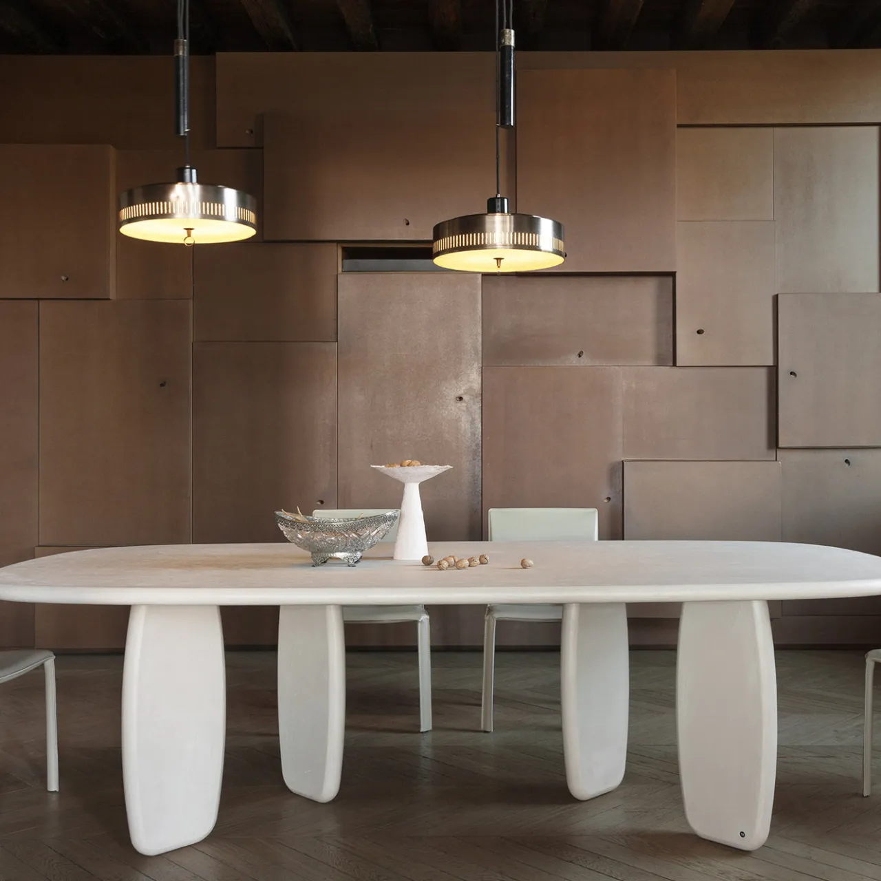 Il tavolo da pranzo Soap presenta un design scultoreo con quattro gambe uniche realizzate in MDF con una particolare finitura laccata marmorino unico malva. Il piano del tavolo di spessore medio, che misura 4 cm, ha un contorno liscio e arrotondato che aggiunge un’estetica morbida alla sua forma contemporanea. Questo tavolo da pranzo unisce una silhouette minimalista a una finitura testurizzata, creando una presenza sobria ma elegante adatta agli interni moderni.