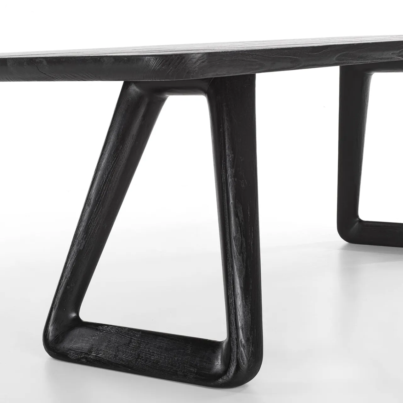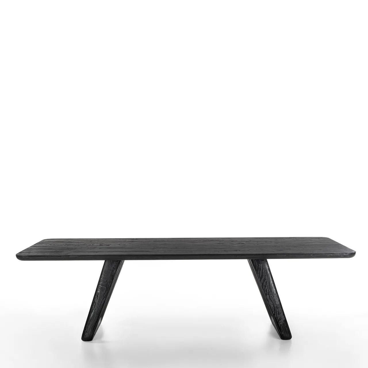 Tavolo da pranzo con piano in legno massello nero composto da doghe incollate e bordi smussati, sorretto da due gambe realizzate interamente in legno massello. La geometria raffinata delle gambe unisce linee rette, curve e angoli arrotondati, creando un equilibrio elegante. Progettato da Claudio Bellini, il tavolo presenta un’estetica moderna e raffinata, perfetta per ambienti pranzo sofisticati.