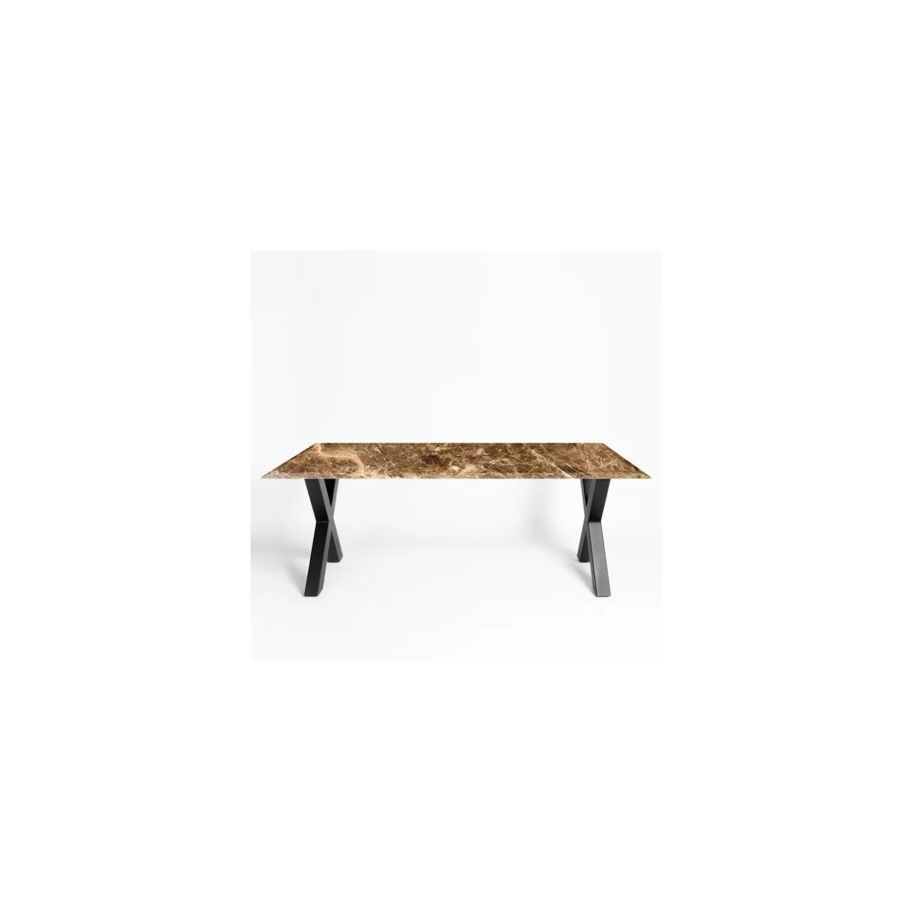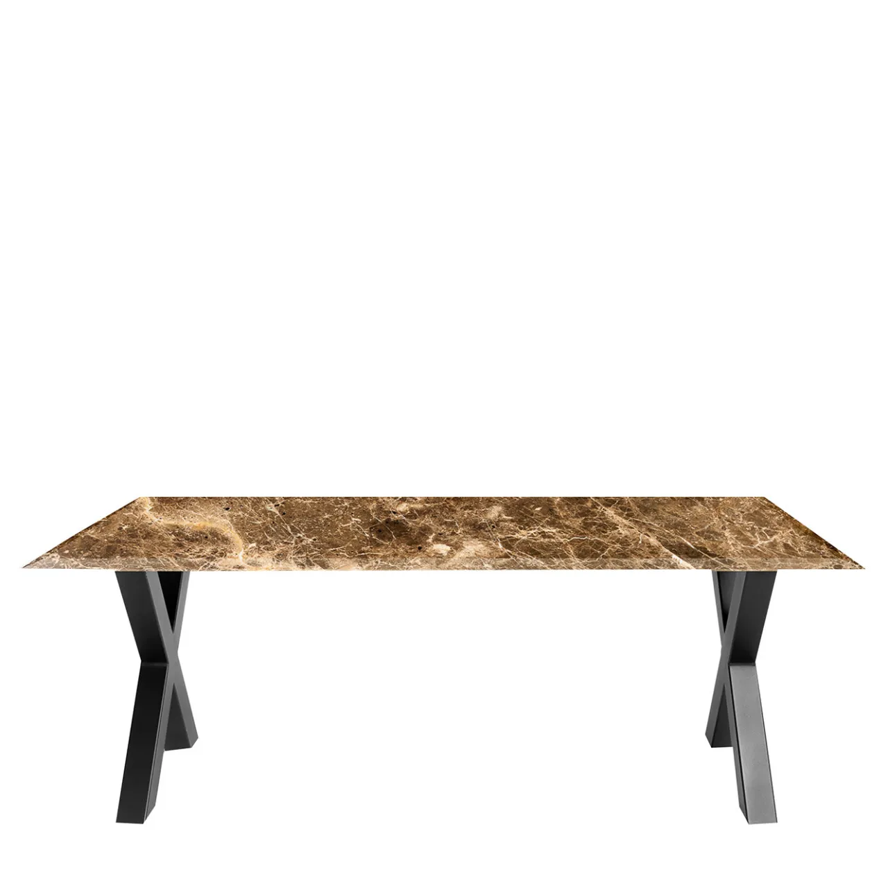 Splendido pezzo forte per un interno contemporaneo, questo tavolo da pranzo si distingue per il piano in marmo Marron Emperador, impreziosito da venature luminose che contrastano con la laccatura nera opaca delle gambe in ferro a X. Questo design iconico è personalizzabile nel tipo di marmo e nella finitura del metallo. Chiedete al Concierge per le opzioni.