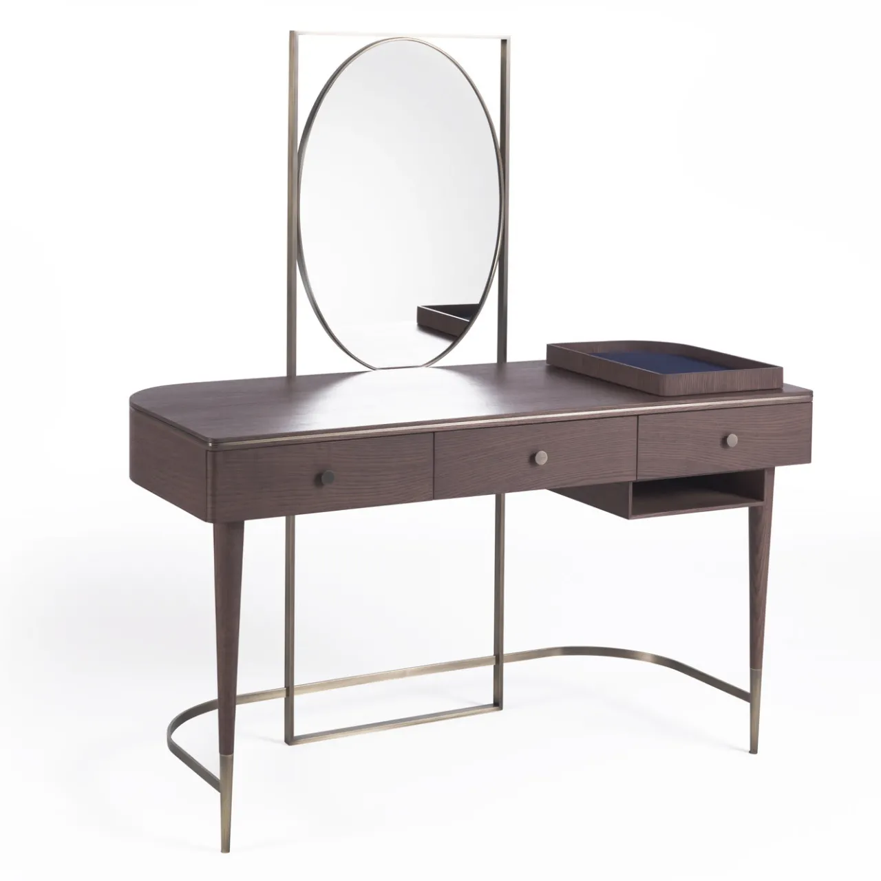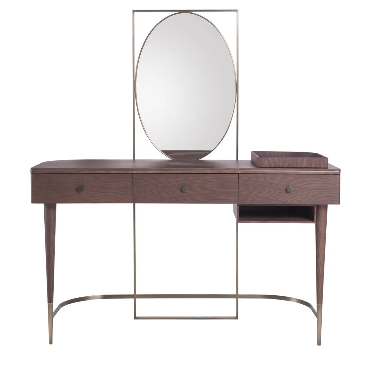 Splendido pezzo dall’allure sofisticata, questo tavolino da toilette farà la sua figura in qualsiasi camera da letto. Squisitamente realizzato in legno di frassino tinto fumo con dettagli in ottone spazzolato (piedi e struttura portante), è composto da tre cassetti e due scatole aperte sul lato destro (una sulla parte superiore del vanity e una su quella inferiore) per gioielli o prodotti di bellezza. Questo splendido pezzo è dotato di un superbo specchio ovale racchiuso in una cornice di ottone spazzolato.