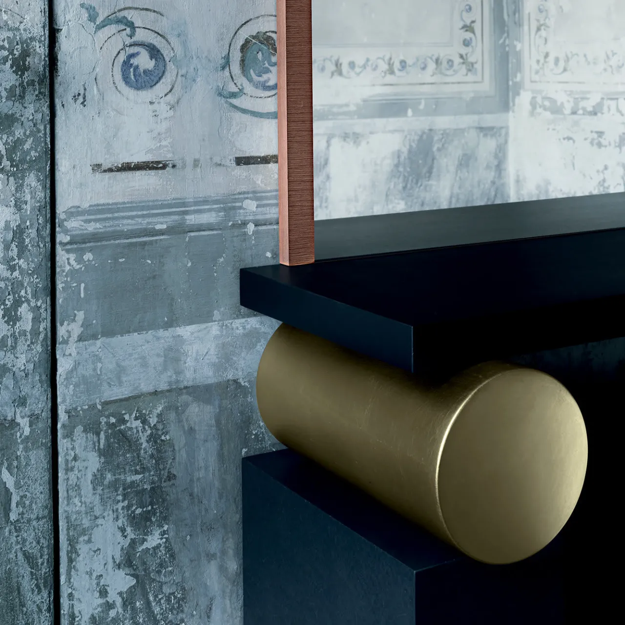 Parte di una serie numerata, questo tavolo da toilette colorato e sgargiante incarna lo stile distintivo di , celebre architetto e designer italiano della fine del XX secolo. Il ripiano e la base sono in legno nero verniciato all’anilina con due elementi cilindrici placcati in oro e sostengono uno specchio di cristallo a forma di cupola con cornice in legno arancione di ALPI Sottsass Designer Collection.