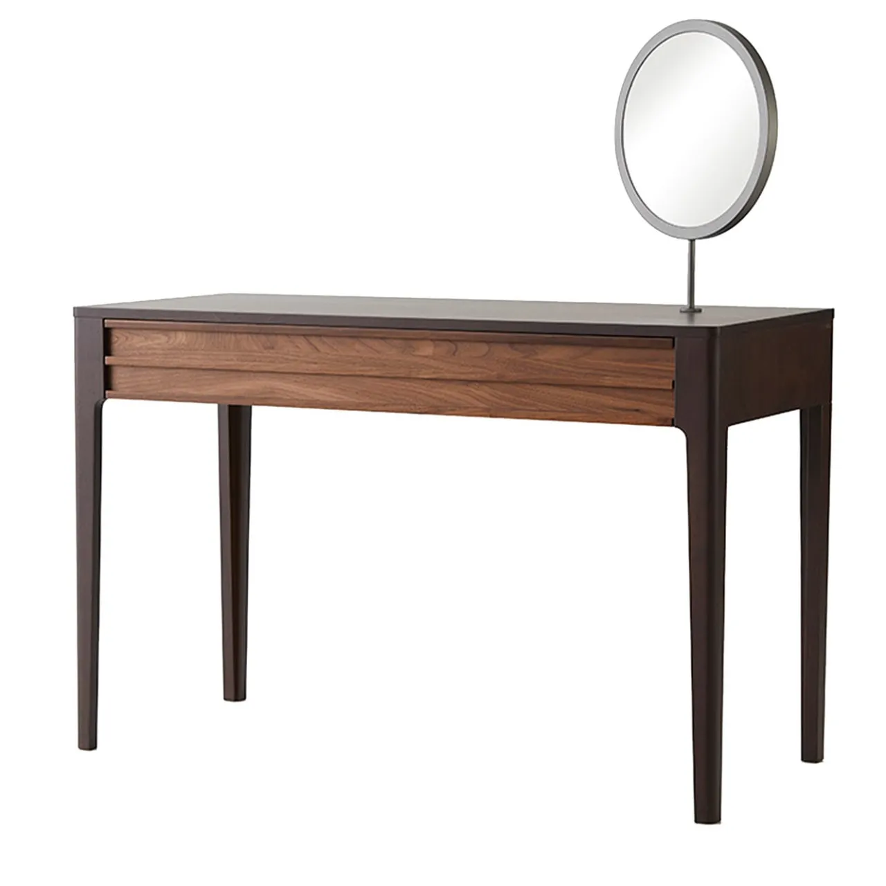 Tavolo da toilette in legno Canaletto Havana con un cassetto rivestito in velluto Oliva e uno specchio integrato con cornice metallica in grafite incrociata.