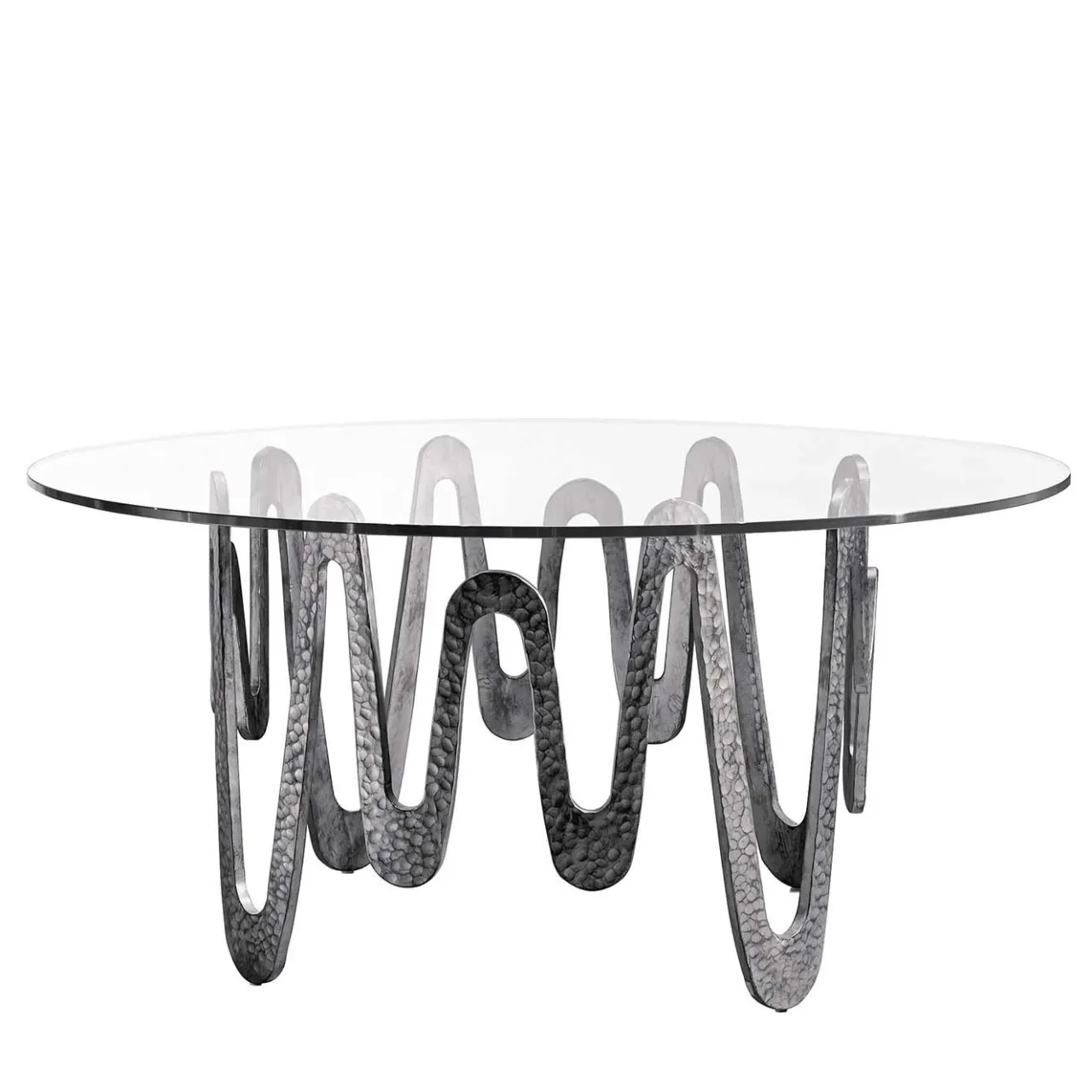 Questo squisito tavolo vanta una silhouette unica ispirata al movimento delle onde, realizzata in alluminio arricchito da una texture martellata e dal bagliore di una finitura in oro bianco. La suggestiva base è sormontata da un vetro trasparente che permette di ammirare l’effetto dinamico da tutte le angolazioni. Disponibile anche in oro giallo, consultare il Concierge.