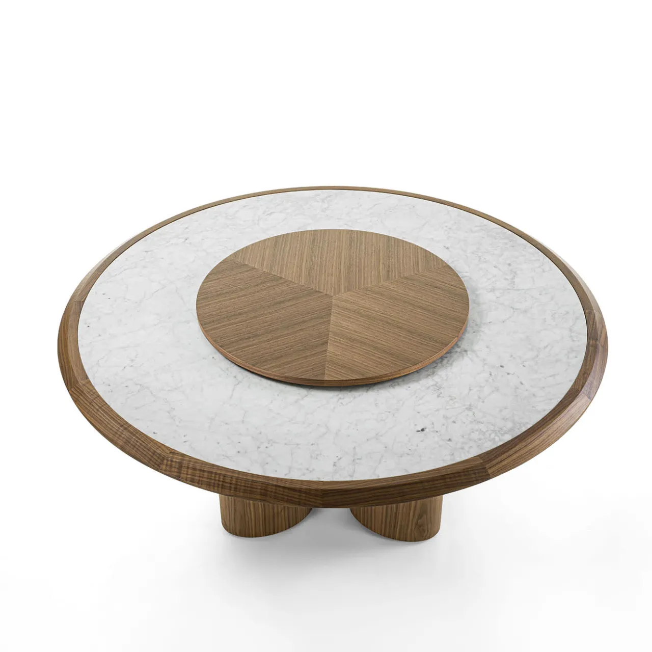 Interamente realizzato in legno di noce canaletto, questo tavolo rotondo presenta un piano in marmo di Carrara di 160 cm di diametro e un Lazy Susan di 80 cm di diametro. Le gambe ellittiche sostengono una struttura in legno massiccio, elegantemente bordata per racchiudere il marmo. La meticolosa lavorazione del legno e l’armoniosa fusione dei materiali creano un design elegante e accattivante. Personalizzabile in varie dimensioni e finiture su richiesta, con l’opzione di un Lazy Susan, questo tavolo combina lusso e funzionalità senza sforzo.