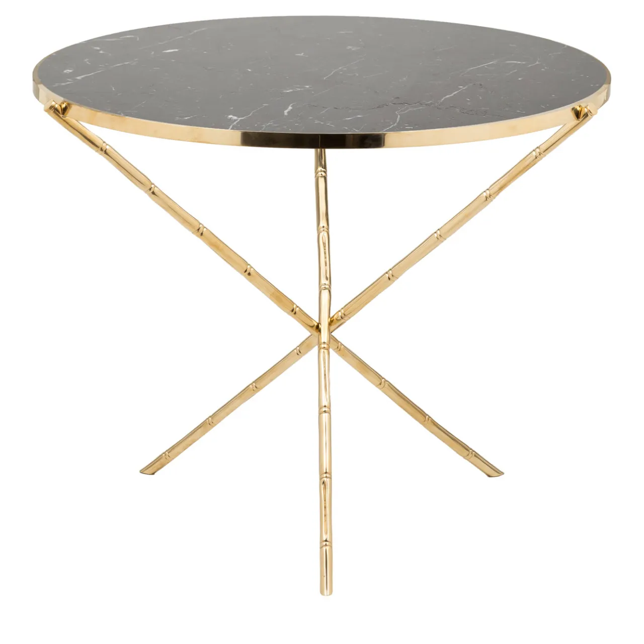 Il piano in marmo nero Marquina di questo splendido tavolo è sostenuto da tre gambe in ottone naturale, realizzate con la tecnica della fusione a sabbia. Le gambe aggiungono un aspetto naturalistico a questo tavolo moderno, con le loro forme che ricordano il bambù.