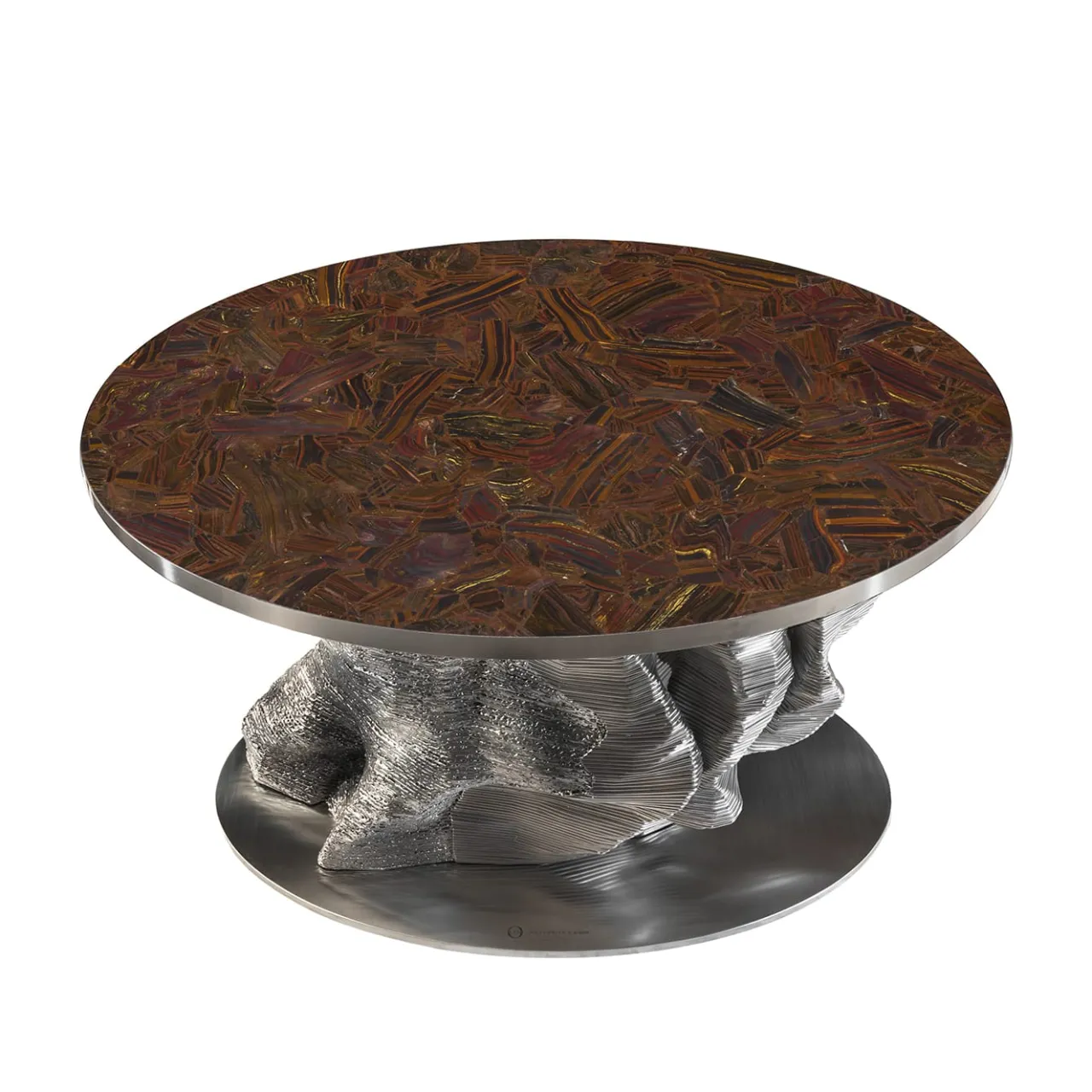 Un piano raffinato ed elegante in gemma di ferro rosso tigrato è elegantemente accostato a una base singolare abilmente realizzata a mano e scolpita da un blocco d’acciaio in una suggestiva forma astratta. Parte di una straordinaria serie numerata di progetti personalizzabili creati da Giò Pozzi, questo magnifico tavolo infonderà agli interni contemporanei un’affascinante allure scultorea. Tecnica unica di lavorazione dell’acciaio: piegato, saldato a mano e lucidato. Chiedete al Concierge le opzioni di personalizzazione.