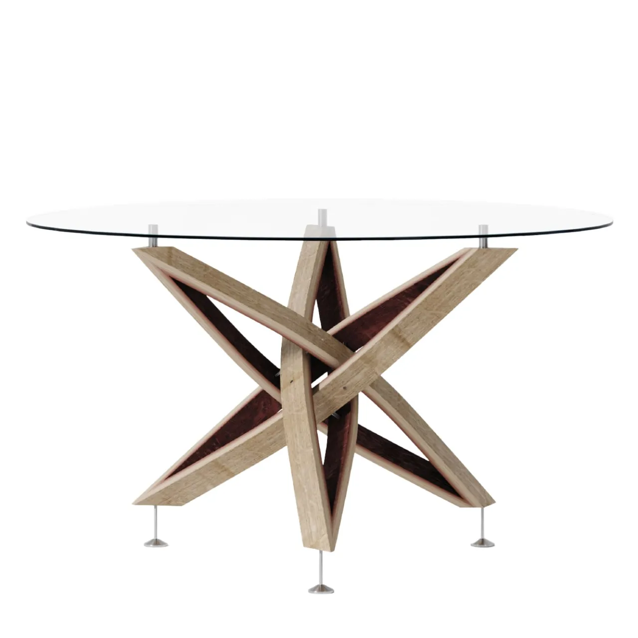 Narni XL è un tavolo in cui l’incastro perfetto e le forme complementari creano armonia nello spazio. Nasce dalla sintesi di un supporto a tre punti e riprende la struttura del tavolino Narni, trasformato in tavolo da pranzo grazie alle doghe Tonneau. La sua struttura ellittica è il risultato del riflesso di due doghe, che rivela il colore vibrante dell’interno ed esalta la bellezza della curvatura. Ogni ellisse racconta il processo di invecchiamento del vino.
