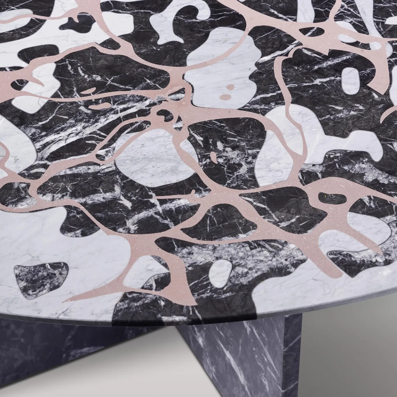 Tavolo da pranzo rotondo in marmo grigio Carnico e bianco Carrara con grafica a marmorizzazione in cemento color terra disegnato da Zanellato/Bortotto. Gambe del tavolo in grigio Carnico con struttura a croce.