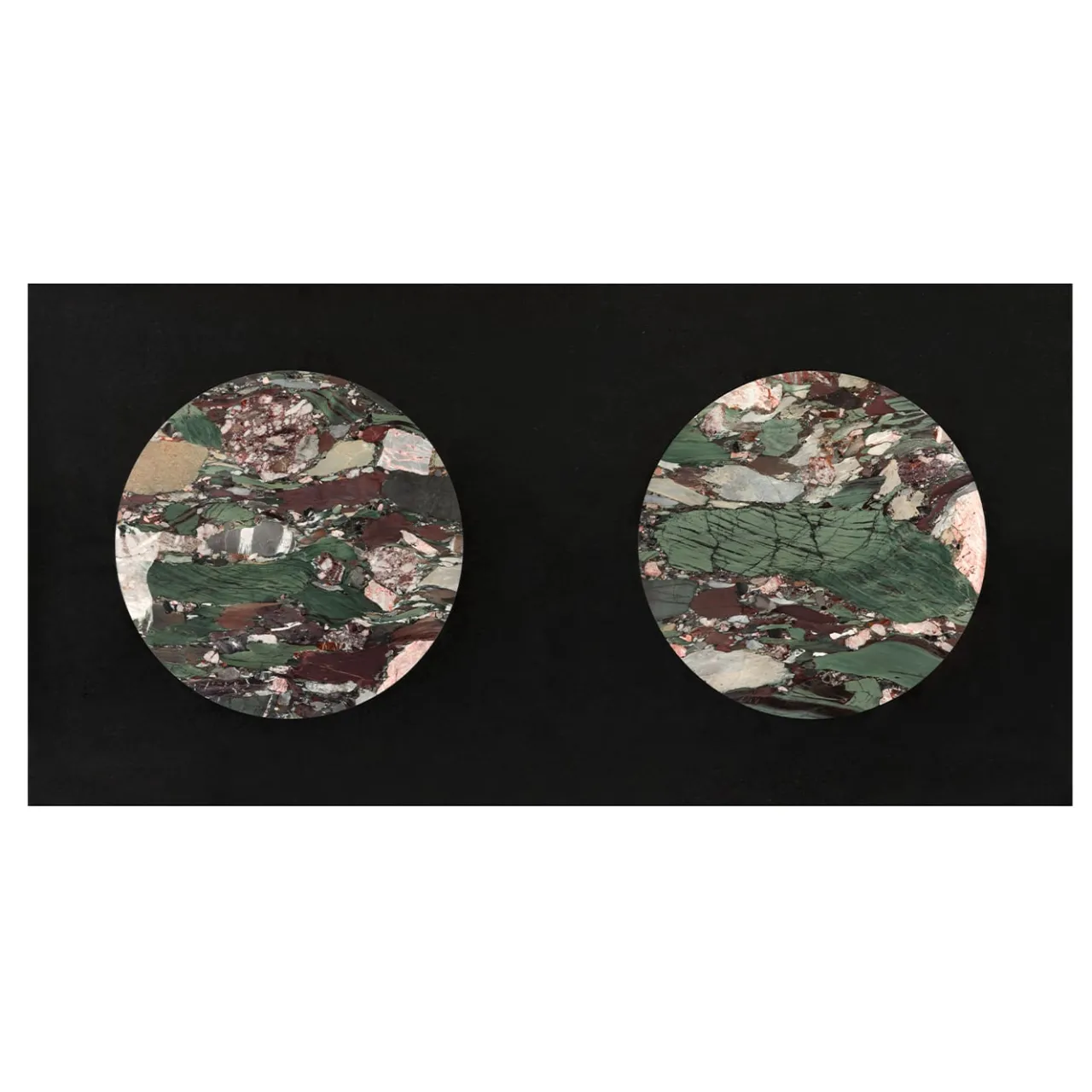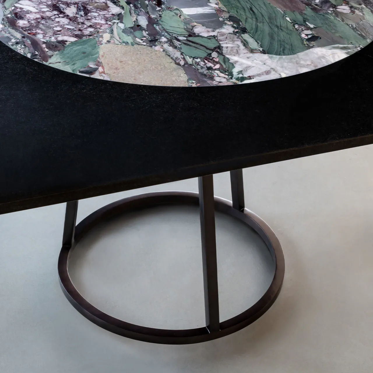 Un design superbo che celebra le forme imprevedibili e sorprendenti che solo la natura può offrire, evocando al contempo la geometria del Pantheon, questo tavolo rettangolare completerà perfettamente gli interni moderni e li accentuerà con un tocco organico. Due ariose ma audaci gambe in metallo rifinite in nero opaco sostengono il piano rettangolare in marmo Nero Belga, in cui sono incastonati due dischi in marmo Opera d’Arte che emergono senza sforzo grazie ai loro intricati tracciati policromi.