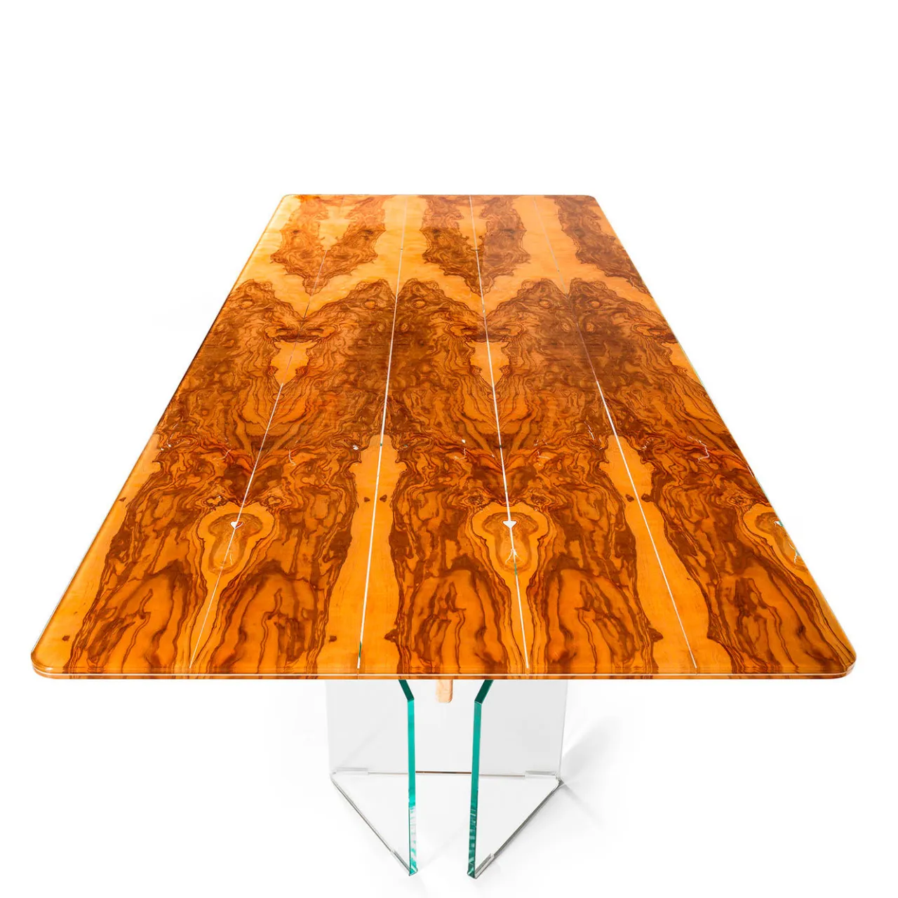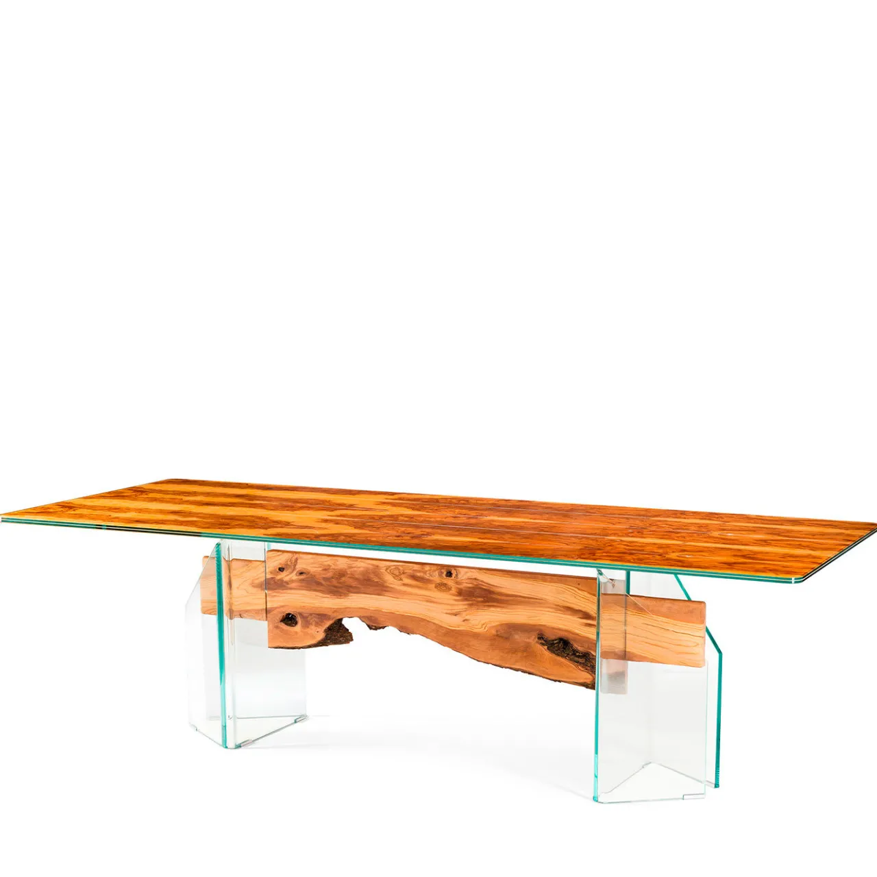 Parte della Glass&Wood Collection, questo esclusivo tavolo sarà un pezzo di spicco in un interno contemporaneo grazie al suo mix di trasparenza e legno che crea un’allure scultorea. Caratterizzato da una splendida base con due gambe in vetro attraversate da una trave in legno d’ulivo, il piano è costituito da sottili sezioni di legno d’ulivo incastonate in due strati di vetro di 10+10 mm che mettono in evidenza le venature distinte e le imperfezioni naturali del legno.
