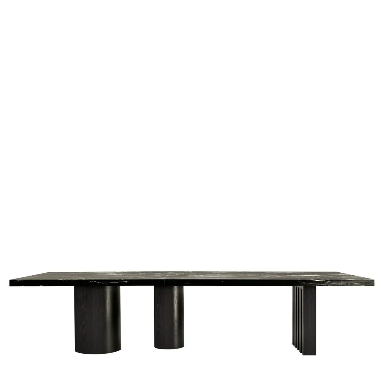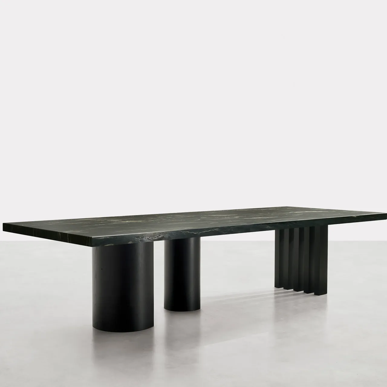 I due tavoli, in versione rettangolare e rotonda, si ispirano allo spettacolare paesaggio della regione montuosa statunitense degli Ozarks: foreste di alberi imponenti con tronchi regolari e dritti che tendono verso l’alto in contrasto con la placidità orizzontale del lago. Base in compensato con impiallacciatura di frassino nero in finitura opaca. Piano in marmo naturale spazzolato Belvedere con lavorazione per 6 cm di altezza. Sono disponibili altre finiture, si prega di contattare il concierge per maggiori informazioni.