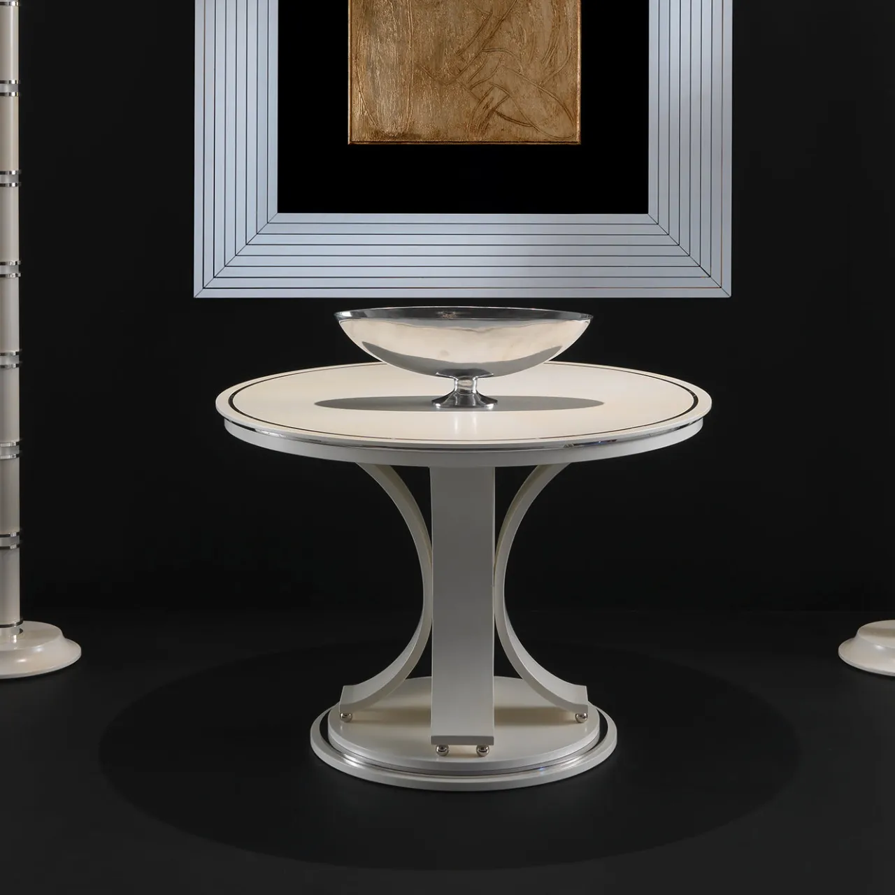 Questo tavolo unico nel suo genere è stato progettato per essere esposto in un ampio corridoio, per costituire un punto focale di grande effetto, da solo o con grandi composizioni floreali. Interamente rifinito in pergamena naturale opaca (col. 102), il piano rotondo misura 115 cm ed è sorretto da quattro gambe a C rivolte verso l’esterno che si raccordano al centro con un elegante disegno che ricorda un fiore sbocciato. La base rotonda è sollevata su uno zoccolo ed è rifinita, come il resto del pezzo, con dettagli in acciaio lucido.