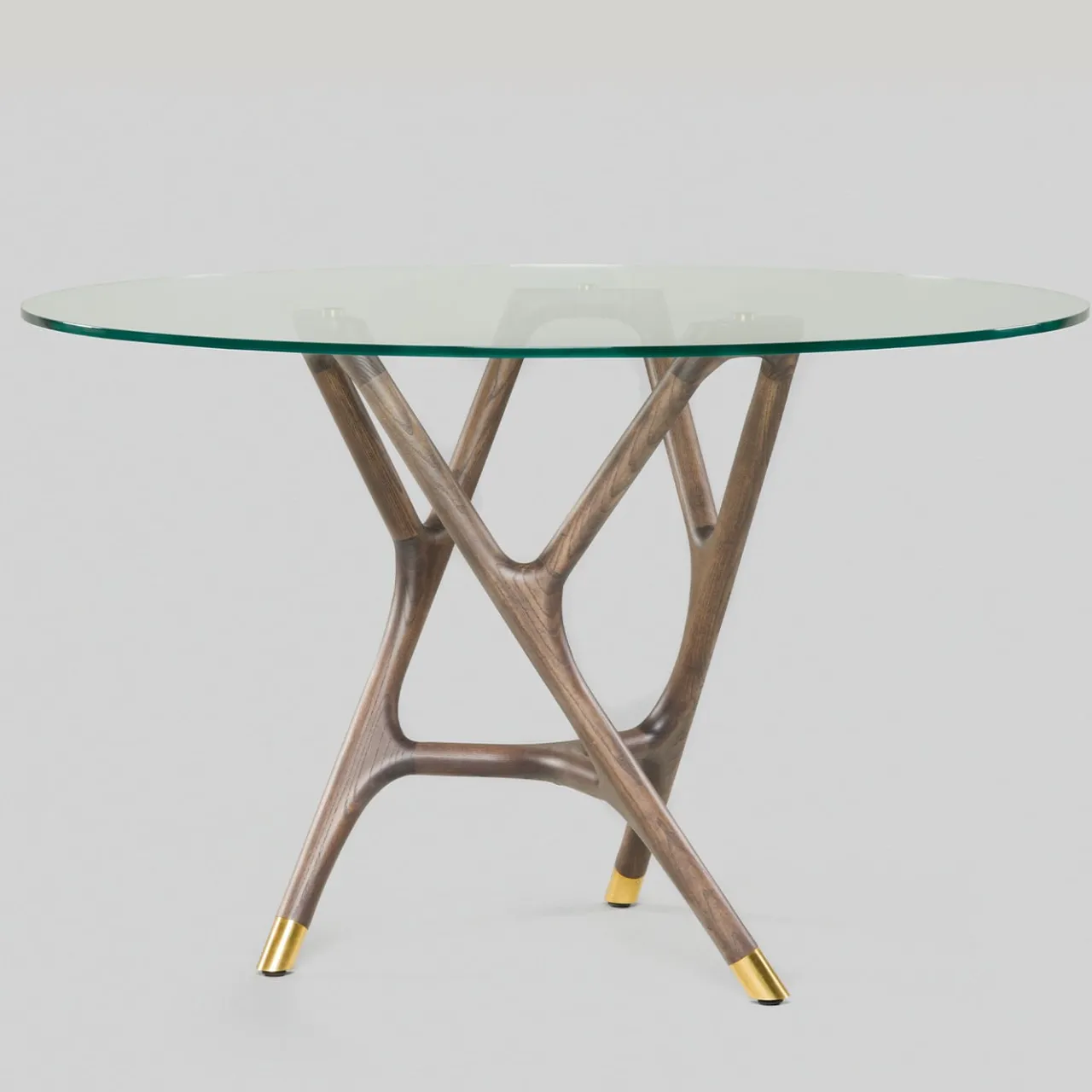 Un’allure retrò-chic definisce questo tavolo di squisita fattura. Le gambe del tavolo in frassino intagliato di ispirazione Decò con piedini in ottone che sostengono il piano in vetro di 120 cm di diametro completano il pezzo. Questo pezzo sarà un raffinato tavolino da caffè o un side table in un ambiente classico o contemporaneo, integrandosi con facilità in qualsiasi arredamento.