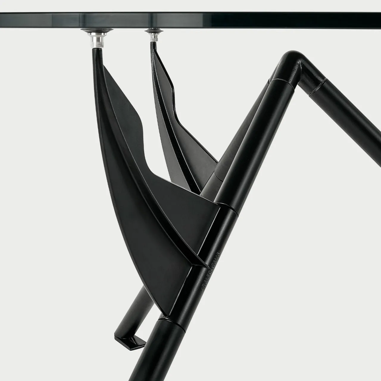 Disegnato da Philippe Starck nel 1984 per l’ufficio privato di François Mitterrand, il tavolo President M si distingue per la sua struttura smontabile e il suo design d’avanguardia. Composto da tre elementi, le sue gambe biomorfe in alluminio, che ricordano le ali di un angelo o le pinne di un pesce, forniscono un solido sostegno a un piano in vetro fluttuante. Questo tavolo fonde impatto visivo e praticità, rendendolo ideale per un ufficio o una casa raffinati.