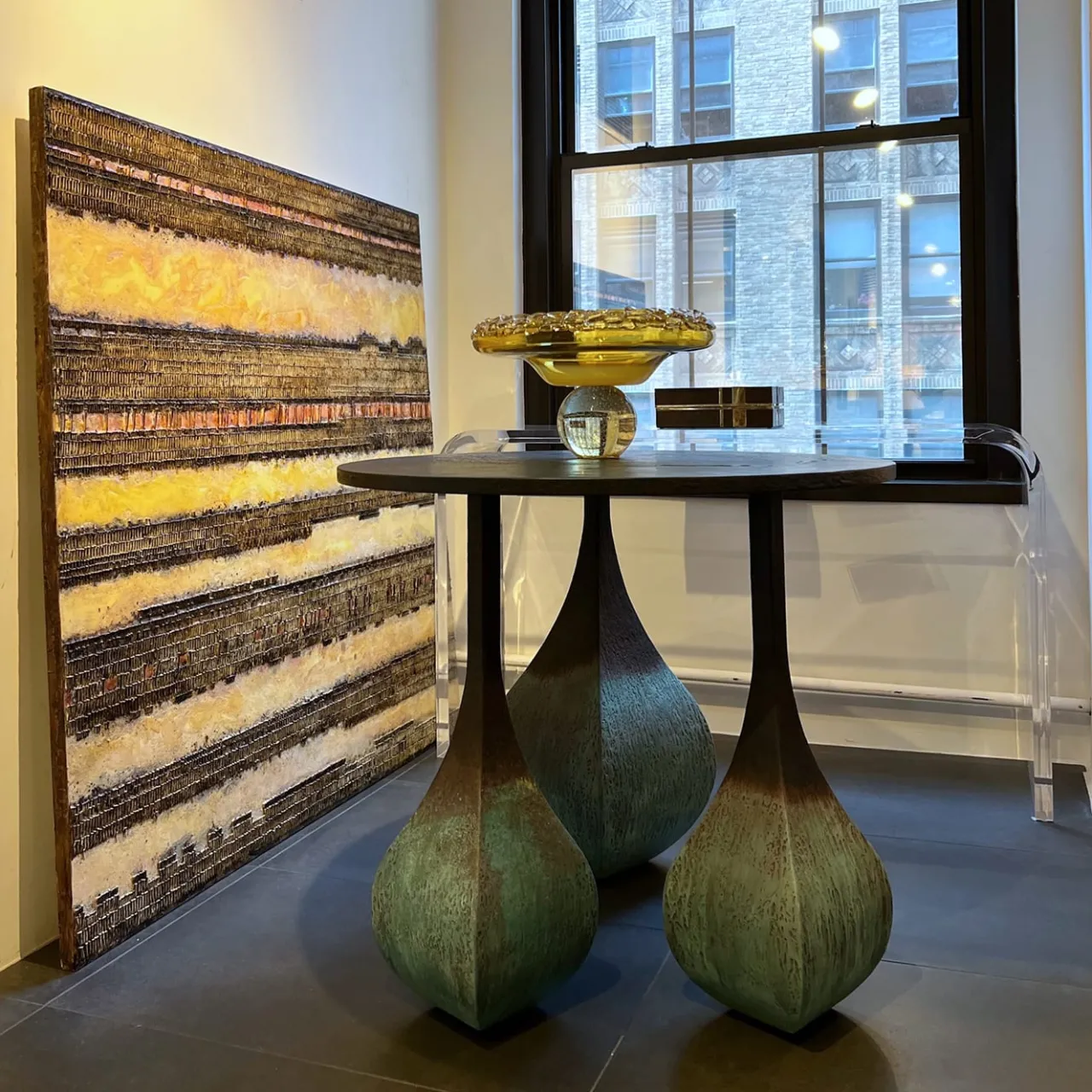 Il semplice ruolo di tavolo ordinario lascia il posto all’impatto spettacolare di un autentico oggetto d’arte in questo pezzo in edizione limitata. Ispirate giocosamente ai pezzi degli scacchi, le tre gambe scultoree vantano una colorazione unica ottenuta grazie a una speciale patina di metallo liquido, mentre il piano circolare è rifinito con un metallo liquido testurizzato a mano per ricreare un effetto di fusione di straordinaria raffinatezza.