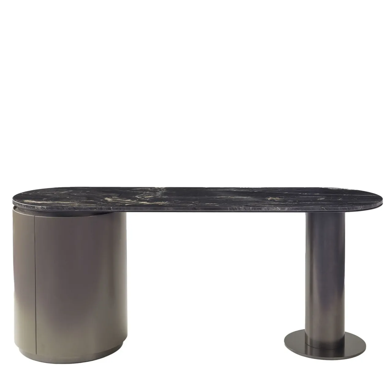 Concedetevi la raffinatezza di questo tavolino da toilette. Realizzato in modo impeccabile, il doppio telaio è realizzato in compensato curvato e MDF con una laccatura ebano opaca. Impreziosito da un lussuoso piano in marmo Belvedere e impreziosito da dettagli in Biotite satinata, questo capolavoro eleva il vostro spazio. La funzionalità è assicurata da un’anta con chiusura magnetica, da un cassetto interno con chiusura morbida e da uno splendido ripiano in vetro color bronzo. Esplorate le opzioni di personalizzazione con il Concierge.