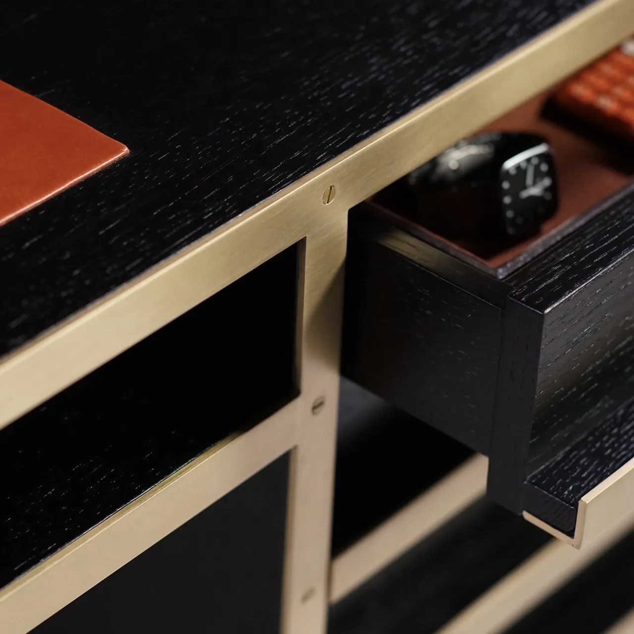 Un pezzo di pura estetica moderna, questa scrivania è un complemento perfetto per un ufficio contemporaneo, o anche per un soggiorno o una camera da letto. Il piano lungo e rettangolare e la cassettiera laterale sono realizzati in legno di quercia con impiallacciatura nera lucida, delineata da una fascia di 3 mm di ottone spazzolato. In ottone spazzolato sono anche la singola gamba obliqua in ottone su un lato della scrivania e la cassettiera con piedini geometrici. Un grande rettangolo di pelle in colore cognac a contrasto copre 3/4 della superficie superiore, aggiungendo un tocco di lusso. Sedia e lampada non incluse.