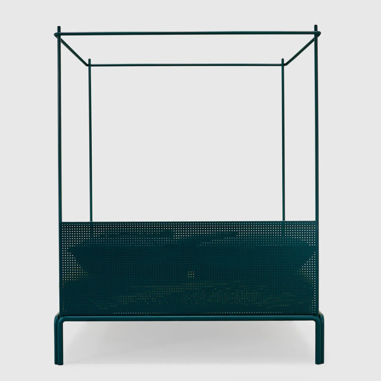 Accattivanti profili geometrici tracciano l’elegante struttura in ferro battuto di questo letto matrimoniale a baldacchino, un design moderno verniciato in una raffinata tonalità blu petrolio. Elementi cilindrici piegati di 21 e 33 mm di diametro compongono la base, i montanti e la struttura superiore del baldacchino. La rete traforata che caratterizza la testata in lamiera rafforza coerentemente il loro riferimento geometrico. La verniciatura, applicata due volte, garantisce una finitura di alta qualità.