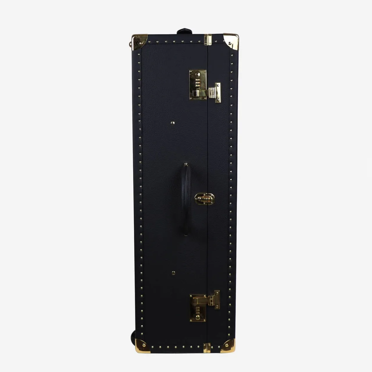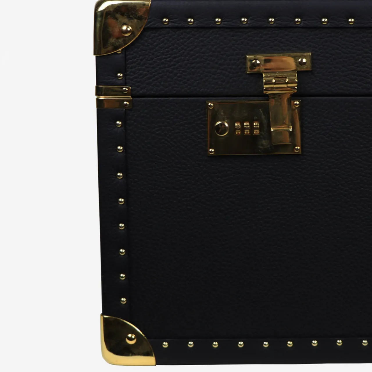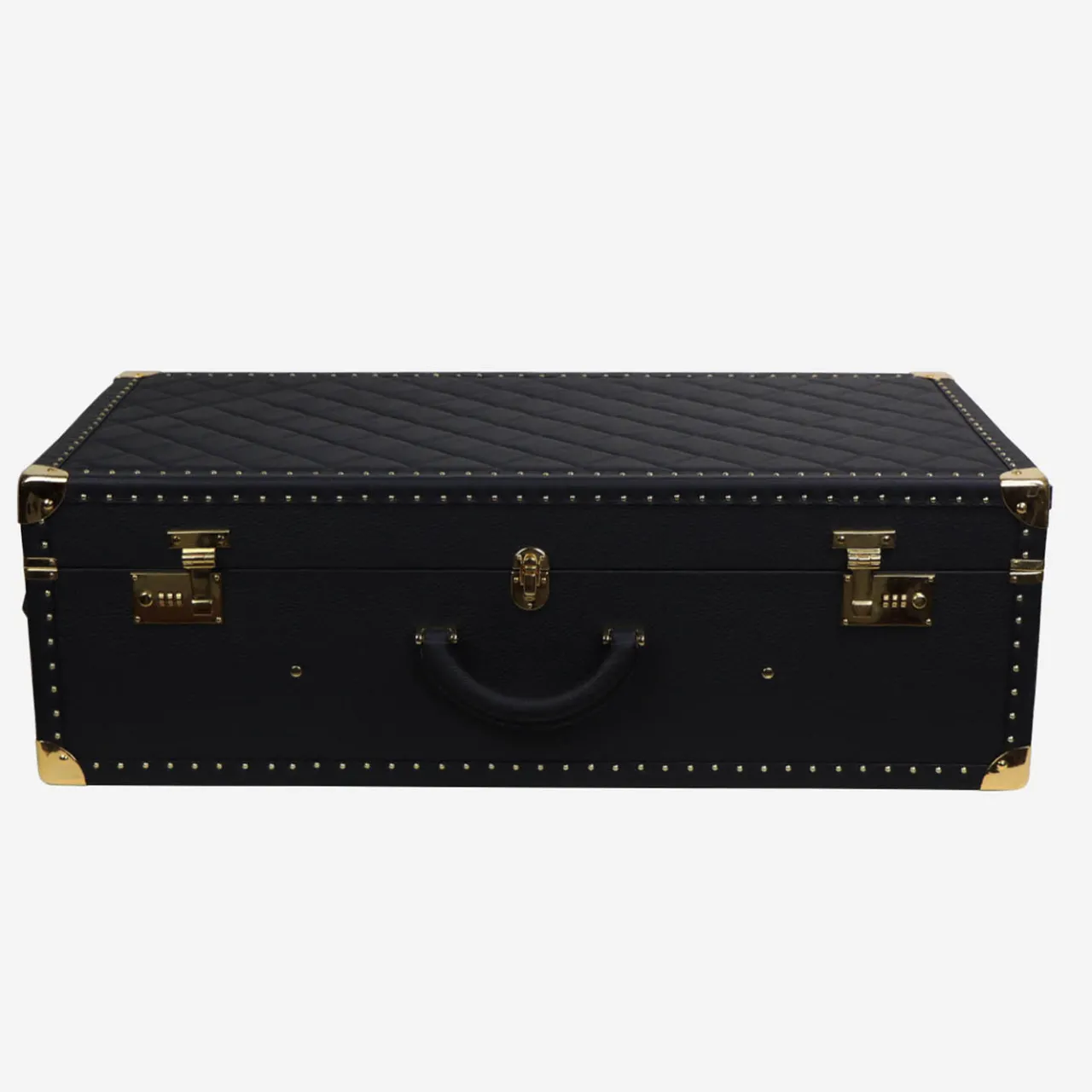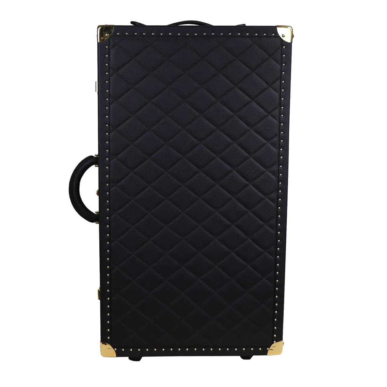 Opulenza classica e prestazioni all’avanguardia si incontrano in questa preziosa valigia artigianale di ispirazione tradizionale. Dotata di piccole ruote e cinghie interne per ottimizzare la praticità, è anche dotata di due maniglie e di una chiusura a combinazione che ne attestano la personalità classica. I tappi angolari e le borchie rifinite in oro impreziosiscono ulteriormente il suo pregiato rivestimento trapuntato in vera pelle nera. Abbastanza ampio da ospitare i gioielli essenziali.